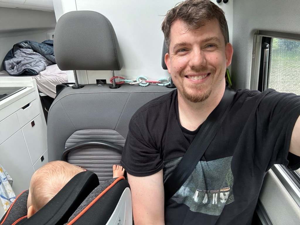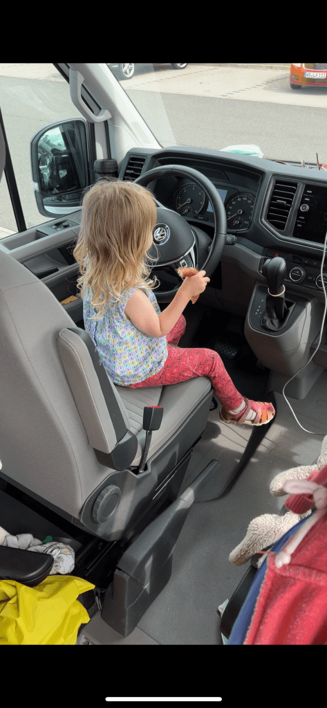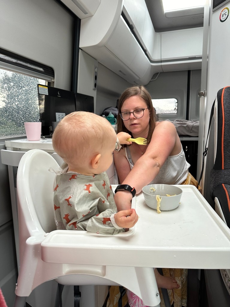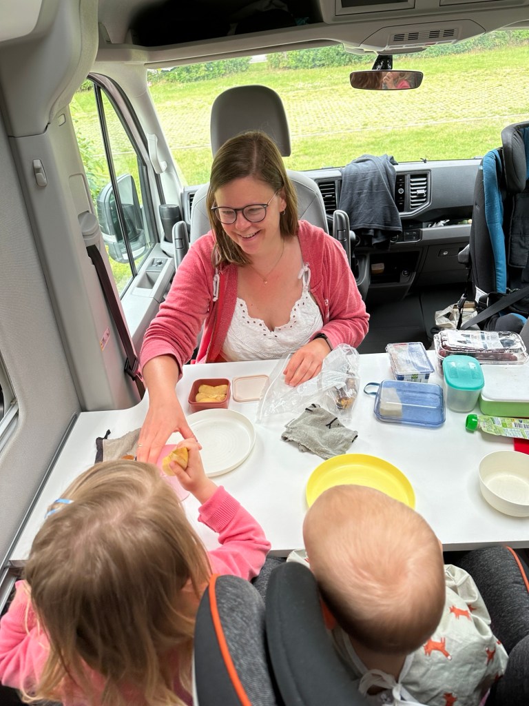 Und dennoch ist man eingeschränkt genug. Das Frühstück haben wir dank Kindersitzen und der Tischplatte des Campers sehr beengt im Auto veranstaltet. Wir versuchen die Kinder, nach Möglichkeit, selbstständig essen zu lassen und das gepaart mit der Enge ist natürlich ein super Nährboden für Stress. Ich kann noch immer nicht so gut damit umgehen, wenn Essen auf dem Tisch, im Gesicht oder an den Händen verschmiert wird. Und wenn ich selbst dann auch noch mehr und mehr abbekomme, steigt bei mir der Stress Level. Manchmal kratzt es mich kaum, aber meistens eben schon. Und ich arbeite daran, dass es besser wird.
