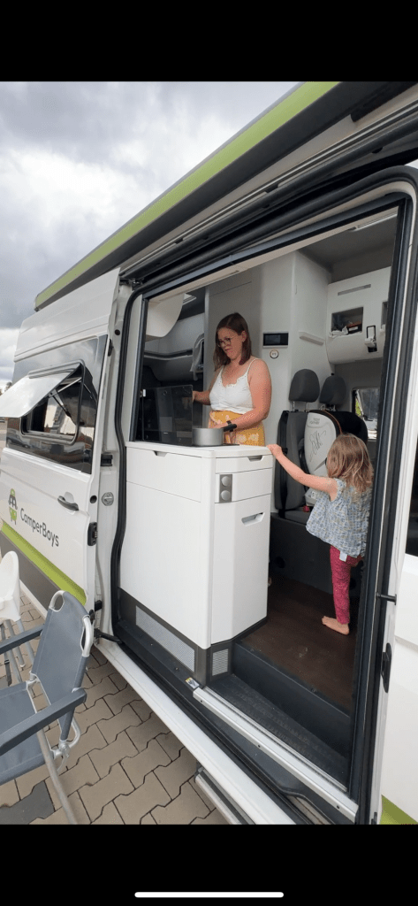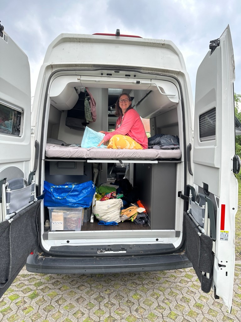 Das große Bett im Heck des Campers und die Stehhöhe sind direkt sehr angenehm, weil wir trotz wechselhaftem Wetter, nicht so eingeschränkt sind, wie wir es in einem Bulli wären.