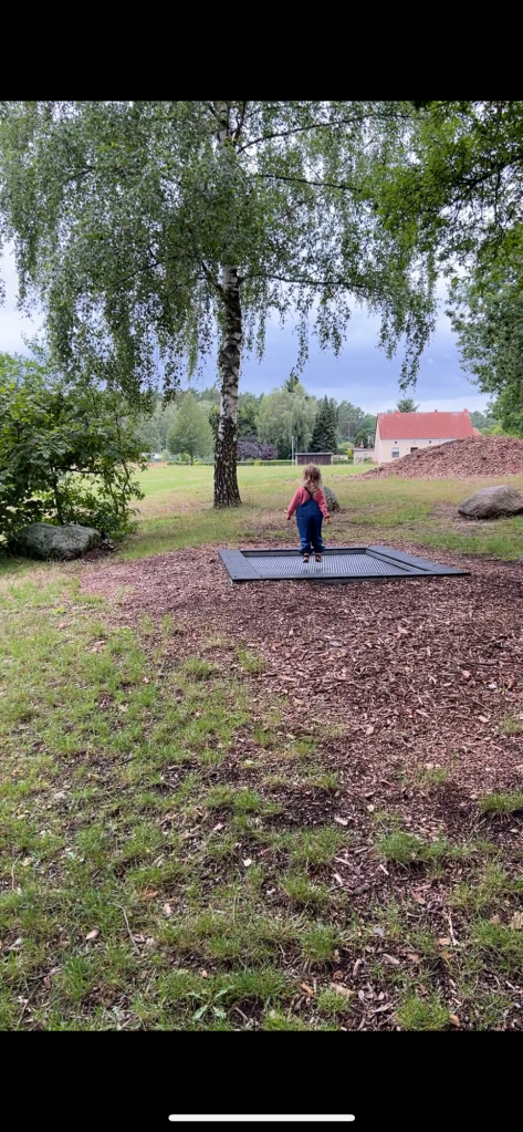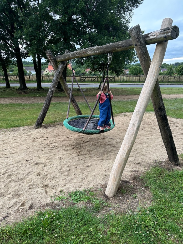 Wir lassen es ganz entspannt angehen. Die Reise ist diesmal etwas lockerer geplant und nicht so durchgetaktet, wie wir sonst immer gereist sind. Der Stellplatz hat einen Spielplatz und nach dem Frühstück geht’s erstmal wippen, schaukeln und klettern. Bis es nach fünf Minuten anfängt zu regnen. Kurz in den Camper, Regenhose holen und als es weniger regnet, geht’s wieder raus.