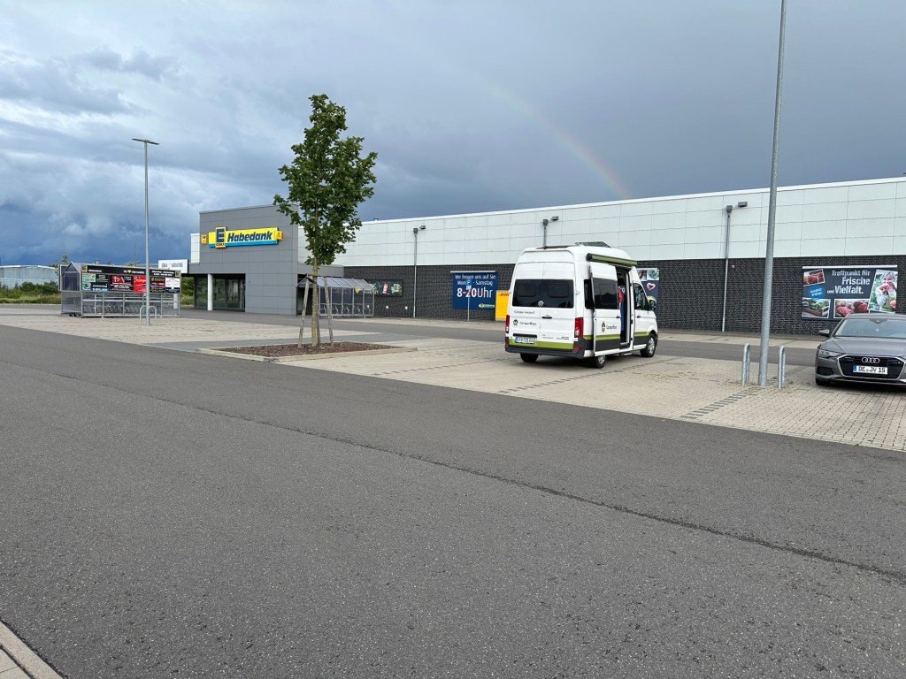 Ach ja, also, wir brechen dann in Raben auf und gehen in Coswig einkaufen. Auf dem Parkplatz von Edeka macht Lu uns Käsespätzle, während ich mit den Kindern auf dem Parkplatz spiele. „Nur auf die dunklen Steine springen“ und „Bordstein rauf, Bordstein runter“. Nach dem Essen geht es noch bis kurz nach Leipzig, wo Lu uns einen Stellplatz herausgesucht hat. Die Kinder schlafen unterwegs ein und als wir am Stellplatz ankommen, steht schon ein weiterer Camper da und dessen kleine Kinder spielen noch munter. Wir bleiben für uns, lagern die Kinder in die Betten um und genießen noch einen ruhigen Abend zu zweit. Soll‘s ja auch mal geben.