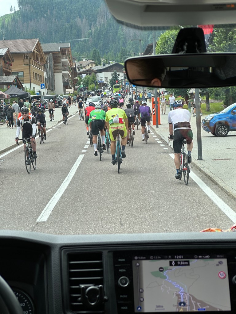 Wir haben einen Stellplatz am Straßenrand, kurz vor Ende der Stadt Kolfuschg, gegenüber von einem Hotel. Aufgrund einer mehrtägigen Fahrradveranstaltung, von der wir bei der Planung nichts wussten, ist viel los in der Gegend. Der Maratona dles Dolomites. Am Vortag wurde schon viel aufgebaut. Kameras, Schilder, Stände, Absperrgitter.