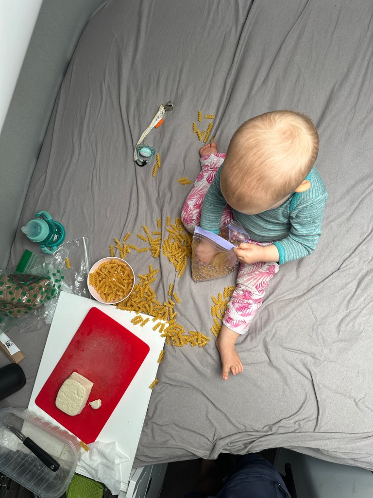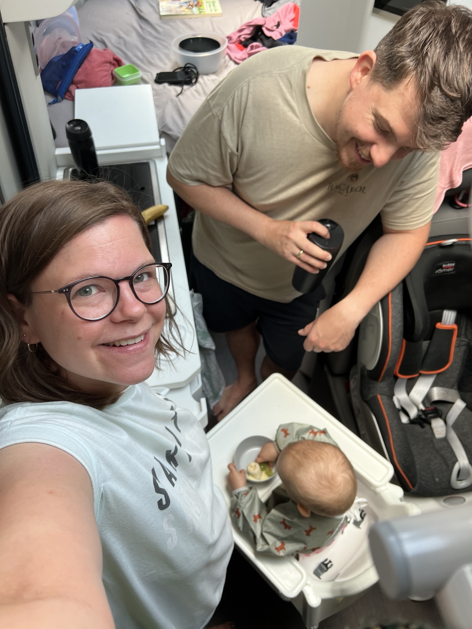 Lu ist eher der Typ Joghurt mit Obst und Müsli oder Körnerbrot mit Aufstrich und ich eher Team Nüsse und etwas Obst oder Gemüse und ggf. etwas Käse. Zu Hause ist es bei weitem nicht so gesund, zumindest bei mir, aber auf Tour macht es vieles leichter, wenn das Frühstück einfach und reduziert ist. Nur lässt sich das nicht immer so recht mit dem Frühstück der Kinder vereinen. Kinder wollen das eine Mal nur Weintrauben, ein anderes mal nur Banane, manchmal Brei, manchmal bloß kein Brei, manchmal Brot ohne alles, aber mit Butter, manchmal mit Camembert, aber nur ein Streifen. Und weil dann oft etwas liegen bleibt, was wir nicht nochmal verpacken wollen, kommt es dann direkt in den Mund, statt in eine Dose. Und auch das kann falsch sein, weil dann plötzlich doch noch der Rest vom Käsebrot eingefordert wird, was man allerdings gerade gegessen hat.