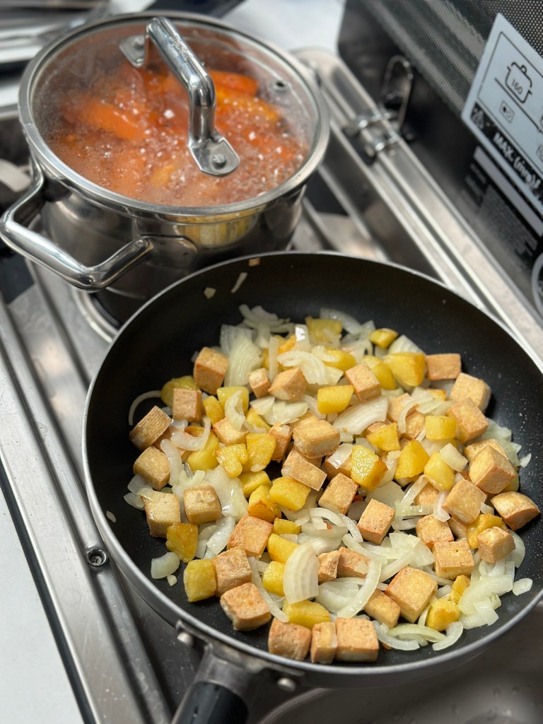Wir fahren weiter zum Pordoijoch, weil wir dort den Bindelweg wandern wollen. Zumindest einen Teil davon. Aber als wir dort ankommen, ist der Tag schon recht weit vorangeschritten. Die Kinder brauchen noch etwas zu essen, also kochen wir auf einem großen Parkplatz am Pordoijoch Mittagessen. Gebratener Tofu mit Zwiebeln und Knoblauch und Resten von gekochten Kartoffeln, mit Sahne aufgegossen und dazu Nudeln. Außerdem eine große Portion Möhren, die danach schreien, verarbeitet zu werden. Mit der Kochaktion ist auf jeden Fall besiegelt, dass wir nicht mehr wandern gehen.