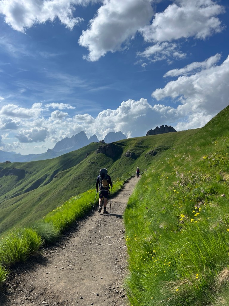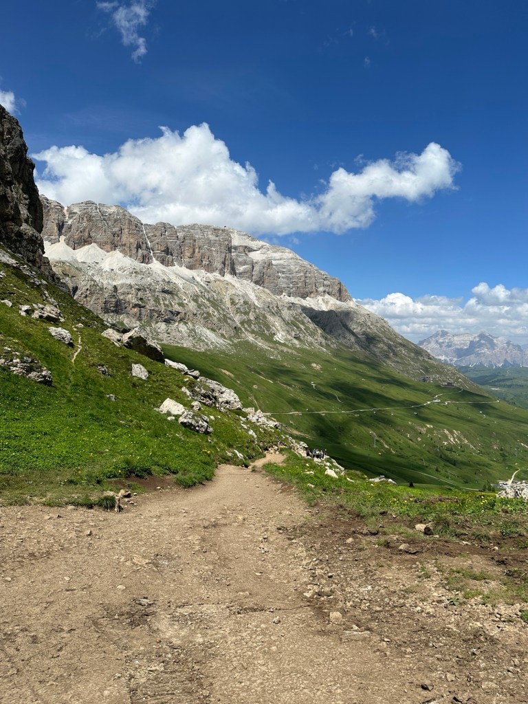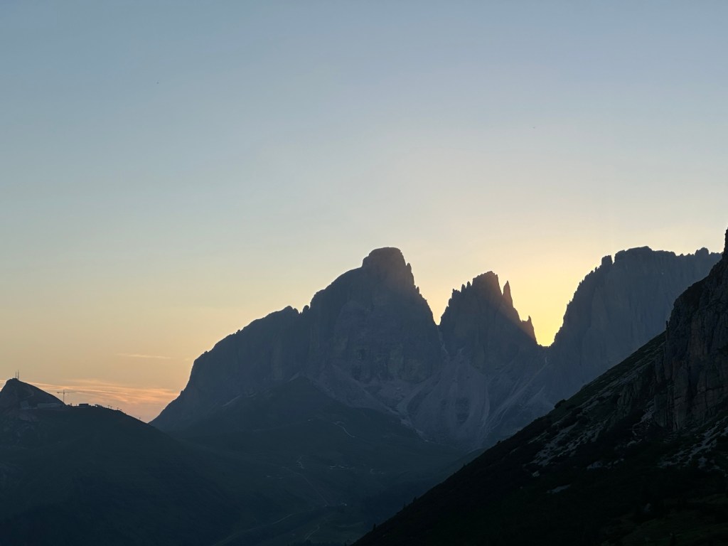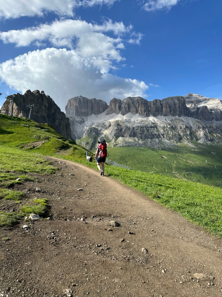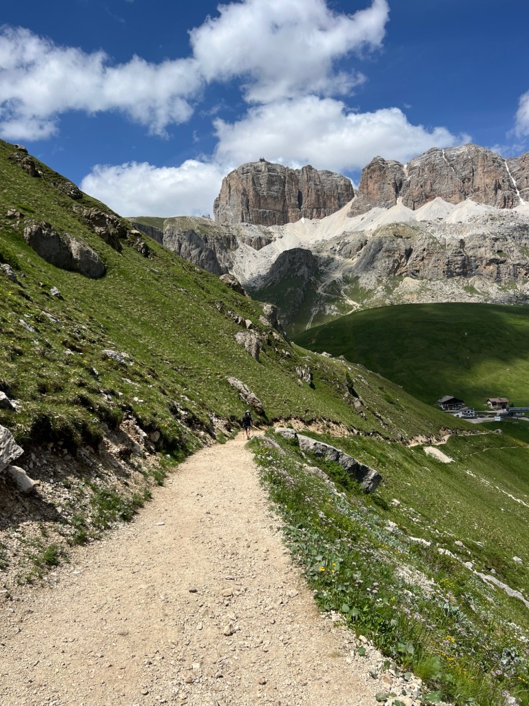 Wir erwachen zum zweiten Mal am Sellajoch. Es soll heute auf den Bindelweg, auf rund 2200-2400 m gehen. Eilig scheinen wir es aber nicht zu haben und so ist der Parkplatz schon rappelvoll, als wir losfahren wollen. Zwischenzeitlich waren wir ein paar mal zugeparkt worden, aber als wir losfahren, müssen wir nur etwas rangieren.