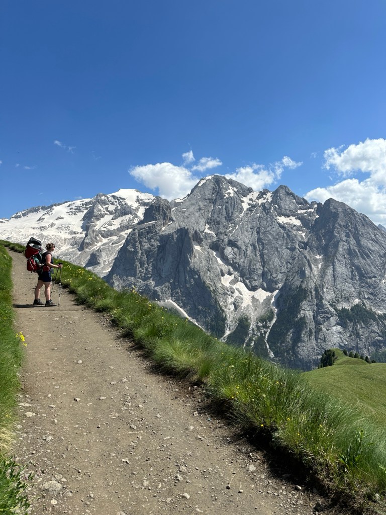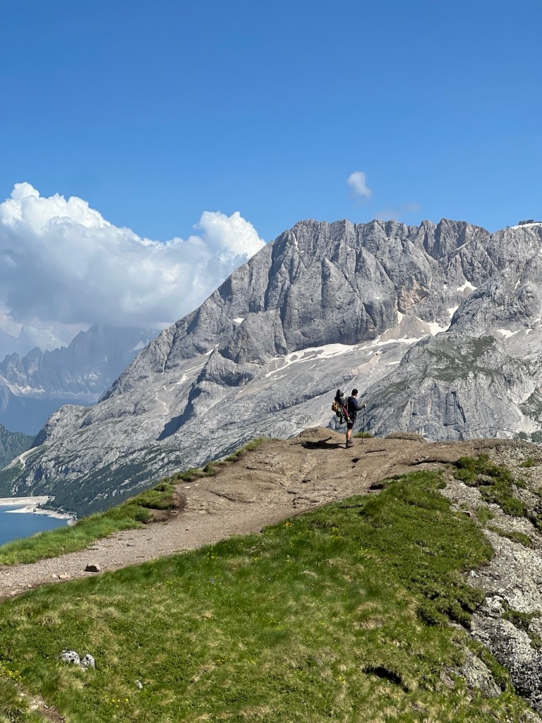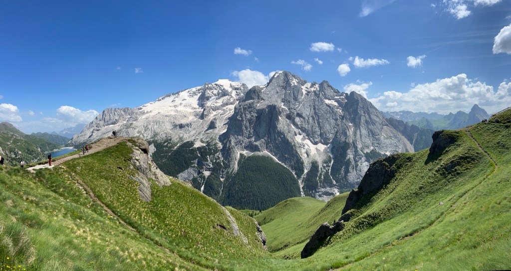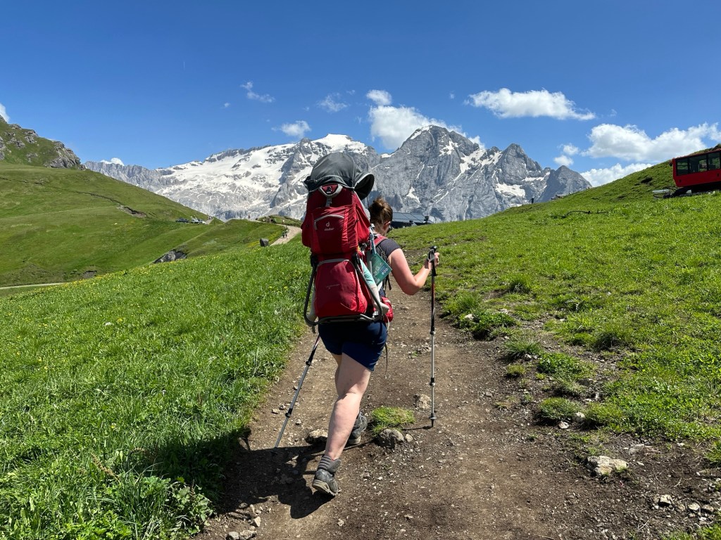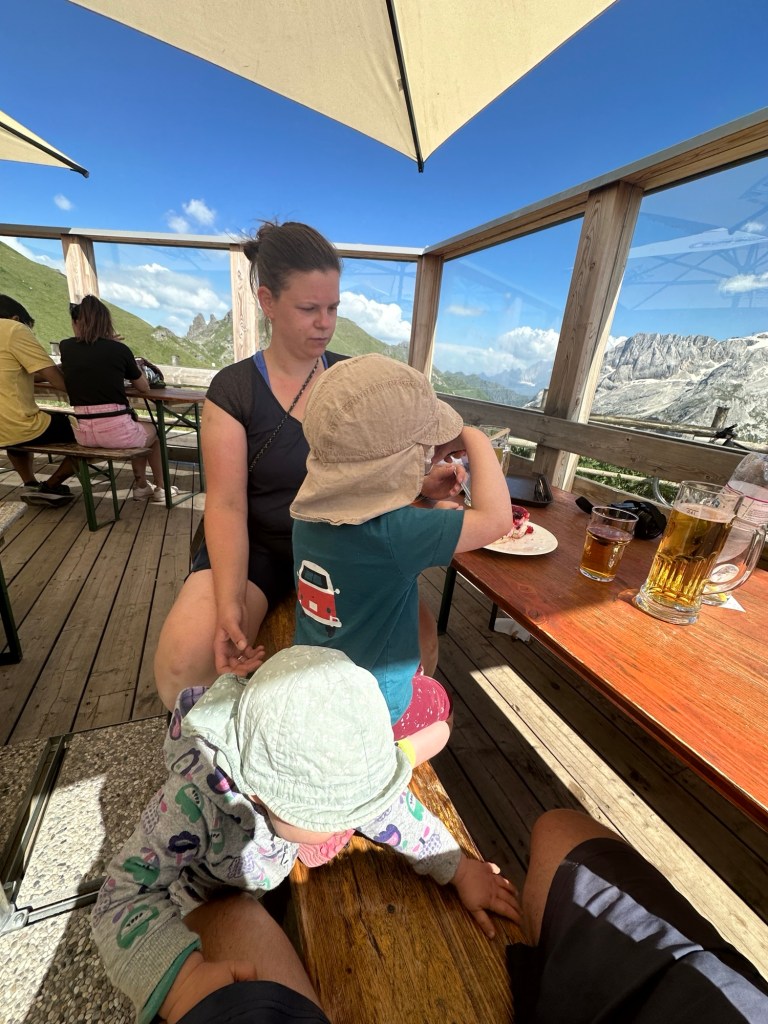 Lu hat die Idee, doch diesmal die Wanderstöcke mitzunehmen. Was soll ich sagen: Beste Entscheidung. Wir wollen den Bindelweg wandern. Zuweilen etwas steiler, aber insgesamt ein leichter Weg. Allerdings auf über 2000 m Höhe. Und mit den zusätzlichen rund 20 kg auf dem Rücken wäre schon die Treppe zur S-Bahn hoch anstrengend. Die Wanderstöcke erleichtern uns den Aufstieg erheblich und auch Abstiege sind wesentlich angenehmer. Unser Ziel auf dem Bindelweg ist das Rifugio Viel dal Pan. Bei unserem letzten Besuch sind wir bis zum Rifugio gewandert, dann bis zur Gondel am Endes des Weges, haben uns Kaffee und ein Stück Kuchen gegönnt und sind zurück gelaufen. Diesmal ist an einen längeren Weg gar nicht zu denken, weil wir dafür wohl früher losgemusst hätten. Damals haben wir im Viel dal Pan eine der besten Polentas auf unseren Wanderungen gegessen, diesmal ist die Küche schon kalt, als wir um 15:30 dort ankommen. Kurze Enttäuschung, aber dann hole ich uns ein Bier, ein Radler, einen Apfelsaft und ein Stück Waldfrucht Torte und wir genießen die Aussicht auf die Marmolata, den höchsten Berg der Dolomiten. Die Kleine geht viel stiften und konsultiert fremde Wanderer mit unverständlichem Baby-Sprech.