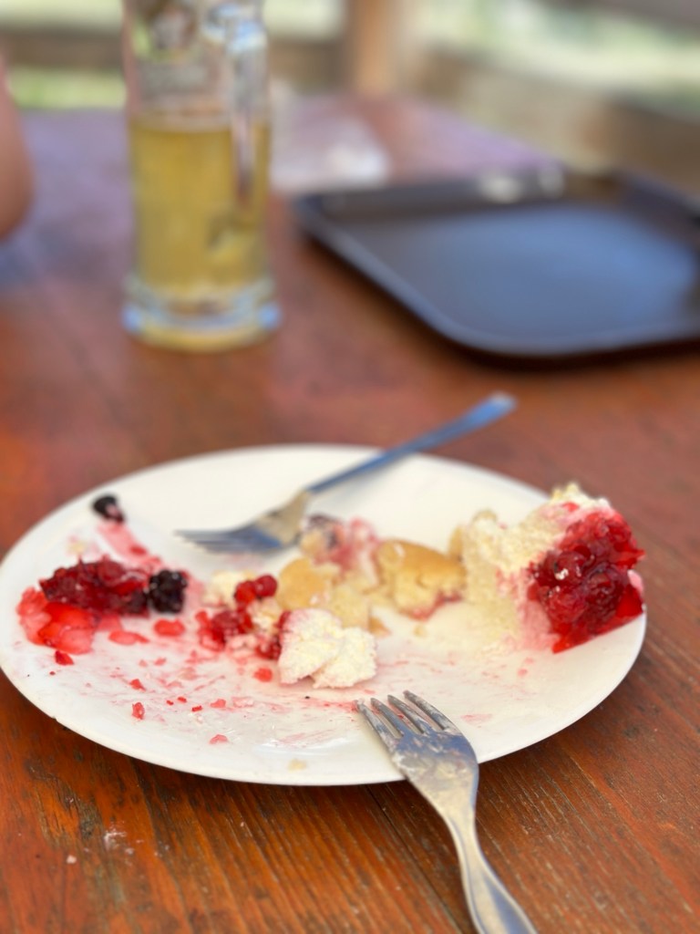 Beim Spielen rutscht die Große von der Bank ab, stößt sich den Hinterkopf am Tisch und weint bitterlich. Lu kümmert sich um die Große, während die Kleine aus Empathie mitweint und dann von mir getröstet wird. Es sind nicht viele Wanderer vor Ort, aber sicher 15 Leute sind mindestens akustisch betroffen. In solchen Momenten blendet man das aber am besten aus.