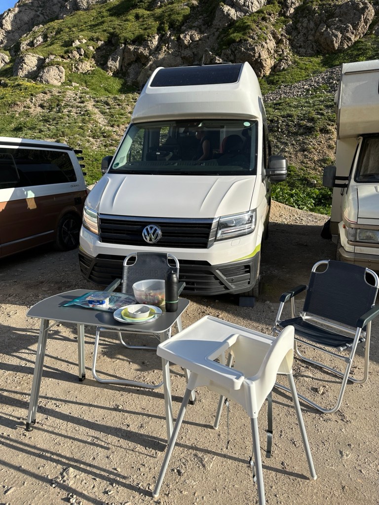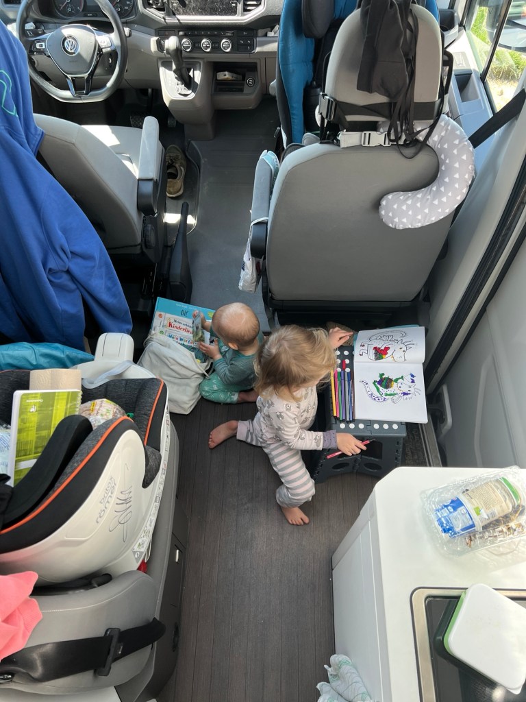 Kurz bevor wir am Auto sind, kommen wir an einem Parkplatz vorbei, auf dem sich Camper aufgebaut haben. Wir fragen direkt, ob man hier übernachten kann und ob es etwas kostet. Ja und nein. Perfekt! Dann müssen wir gar nicht mehr weit fahren! Der Platz ist nicht auf park4night vermerkt und deshalb hatten wir ihn nicht auf dem Schirm. Wir gehen zum Auto, die Große wird gerade wach und wir laden alles ein. Bis wir wirklich loskommen, vergeht eine gefühlte Ewigkeit. Wir fahren 100 m und sind schon am Stellplatz. Hier hätten wir uns womöglich die 10 € für den anderen Parkplatz sparen können. Wir platzieren uns und holen zum ersten Mal Tisch und Stühle raus. Zum Glück haben ich so dicht an einem Sandhaufen geparkt, dass wir die Türen am Heck nur schwer öffnen können. Entsprechend schwer bekomme ich Tisch und Stühle aus dem Heck. Aber wegen Unebenheiten und Pfützen, konnte ich kaum anders parken.
