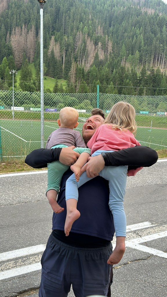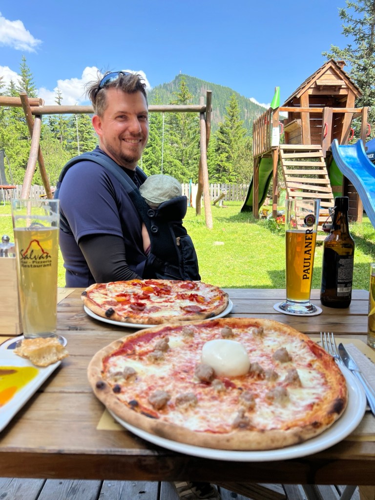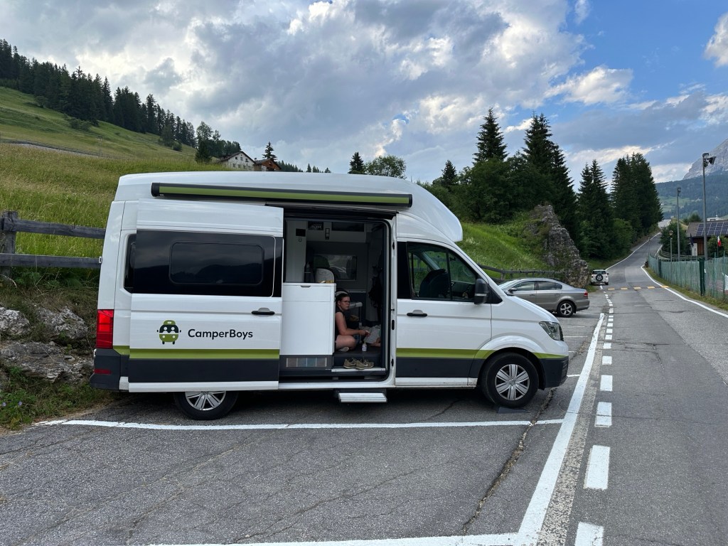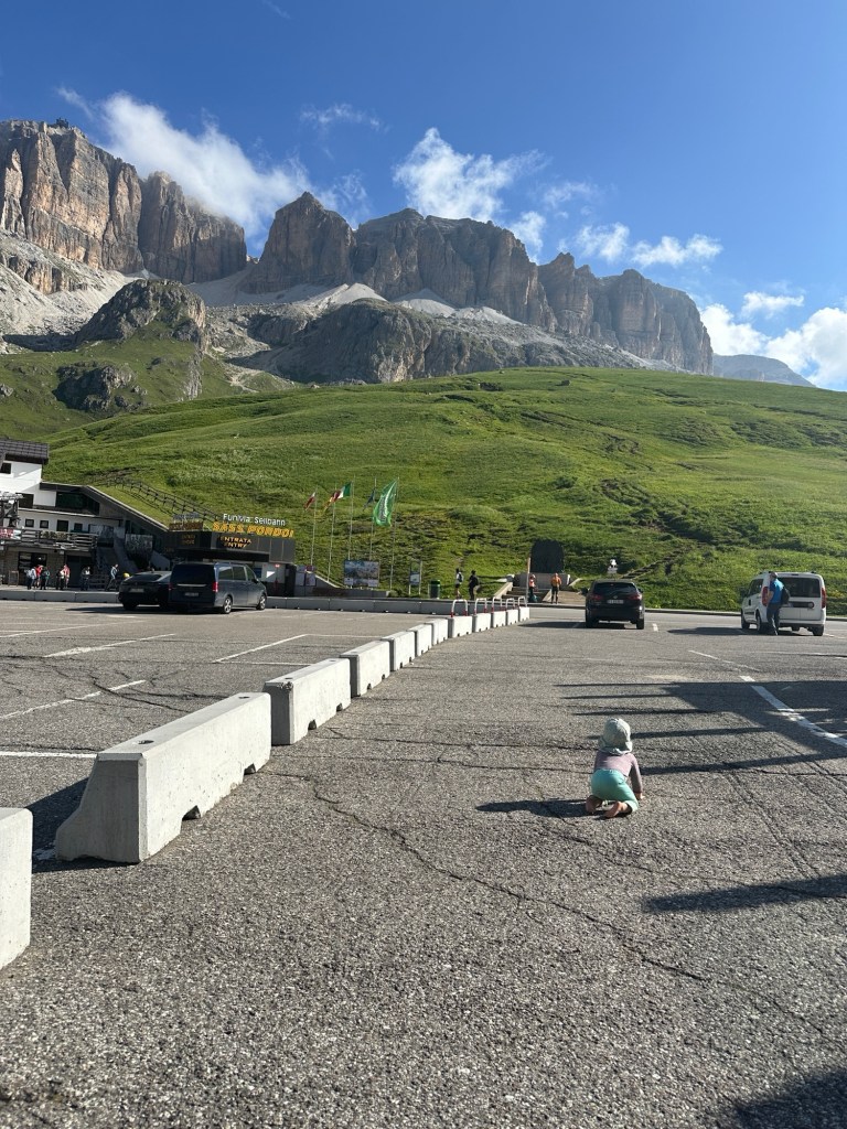 Am Ende des Frühstücks, zurück im Camper, wird es Bodo zu viel. Zu laut. Zu eng. Er geht mit der Kleinen nochmal raus auf den Parkplatz und läuft mit ihr ein paar Schritte. Der Parkplatz füllt sich und wir müssen hier schleunigst weg, denn der Ein- bzw. Ausgang vom Parkplatz wird mehr und mehr zugeparkt und wir laufen Gefahr, hier nicht mehr rauszukommen. Wir treten die Fahrt nach Arabba erneut an, um Grau- und Schwarzwasser zu entleeren und Frischwasser aufzufüllen. Erst dann überlegen wir uns wie es weitergeht.