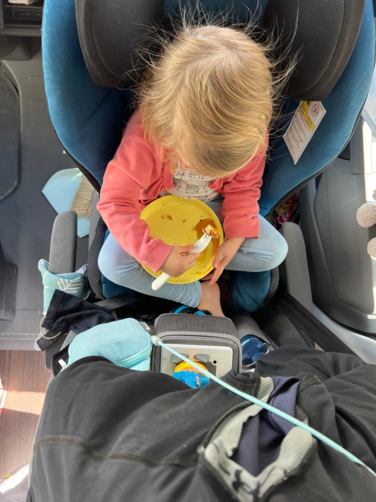 Wir haben noch einen Rest Apfel Mango Mark, das gerade noch essbar ist, perfekt. Während die Große sich mit einem Buch beschäftigt, ist die Kleine unzufrieden. Also geht Bodo mit ihr draußen spazieren, solange ich das Essen vorbereite. Als die Arme Ritter fertig sind, baut Bodo draußen alles auf, Camping Tisch und Stühle und den Hochstuhl. Er begleitet das Essen der Kleinen draußen, während ich das Frühstück der Großen drinnen betreue. Bodo und ich essen selbst hinterher etwas, plus die Reste.