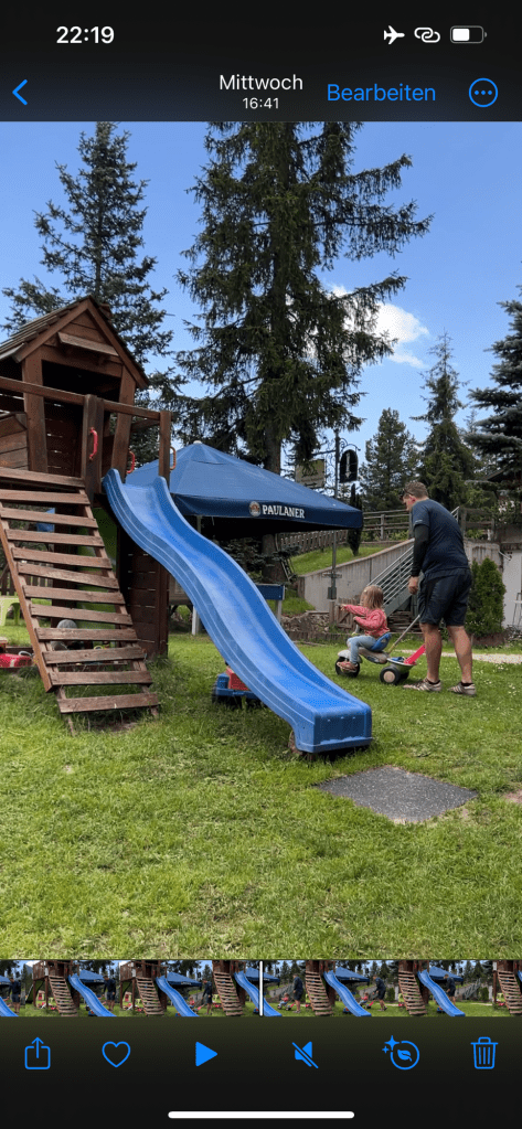 Die Kinder sind happy und bespielen den ganzen Spielplatz. Zwischen 13 und 14 Uhr sagt die Große, das sie Hunger hat. Ich google und wie so oft, kommt uns die Mittagspause in die Quere, aber der Zufall will es so und das Restaurant, in dem wir vor ein paar Tagen das Deutschland:Spanien Spiel schauen wollten, ist das einzige, welches um die Mittagszeit geöffnet hat. Knapp 1 km müssen wir laufen, dafür hat das Restaurant eine große Terrasse mit umfangreichen Spiel und kletter Angebot für Kinder. Sogar zwei Trampoline und ein Dreirad gibt es. Während wir auf das Essen warten und die Kleine noch beim Papa in der trage schläft, spielt die Große vergnügt mit den Spielsachen. Nach dem Essen ist auch die Kleine voll dabei und wir haben das Glück die beiden für längere Zeit beim Spielen beobachten zu können. Darum bestellt Bodo sich noch was zu trinken und wir genießen für einen weiteren Moment die Stille. Aber wie zu erwarten, ist es mit der Stille ganz plötzlich vorbei.