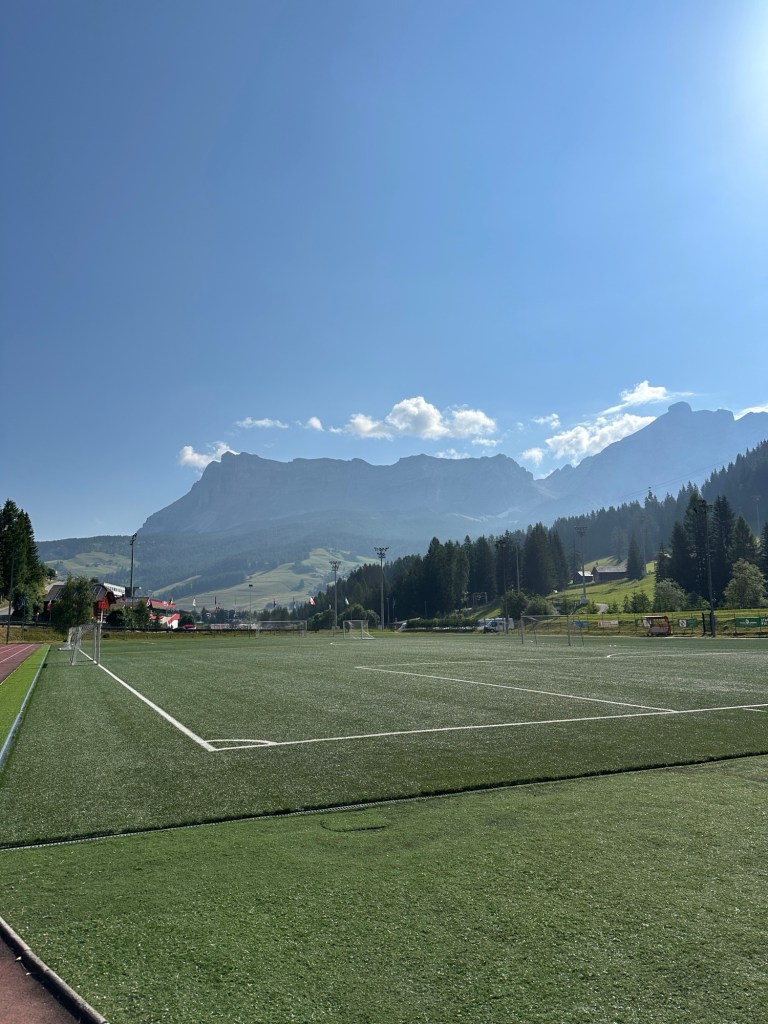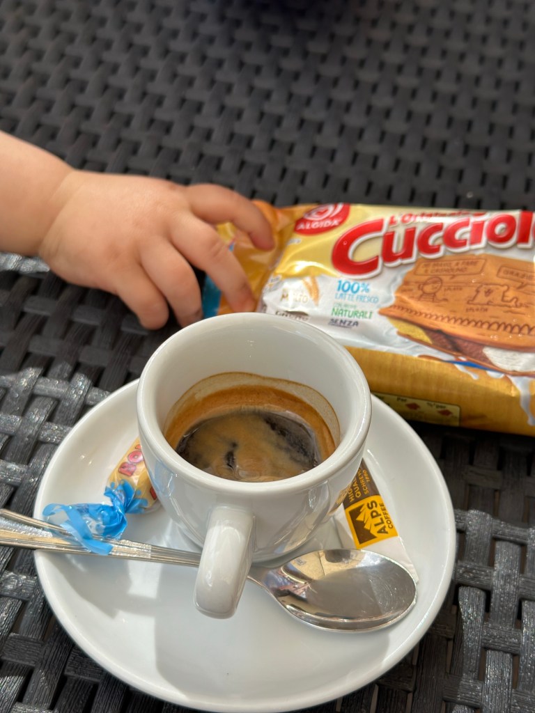 Unser Stellplatz stellt sich als Glücksgriff heraus. Bodo hatte der Großen schon am Abend versprochen mit ihr und der Kleinen am morgen Fußball spielen zu gehen. Also geht er nach dem Frühstück raus zum spielen, während ich den Camper zur Abfahrt vorbereite. Bodo und ich halten Kontakt und er bittet mich zum Eisessen dazuzukommen. Bodo trinkt seinen ersten Espresso in Italien. Die Große teilt ihr kleines Eis großzügig mit der Kleinen, dafür teilt Bodo sein Eis mit ihr. Und auch ich darf mal probieren. Die Kinder und wir sind glücklich und wir ziehen zusammen weiter auf den Spielplatz, der hinter dem Sportclub liegt. Doch die Sonne ist schon morgens sehr stark und wir wollen die Kinder, noch uneingecremt, nicht so lange ungeschützt in der Sonne spielen lassen.