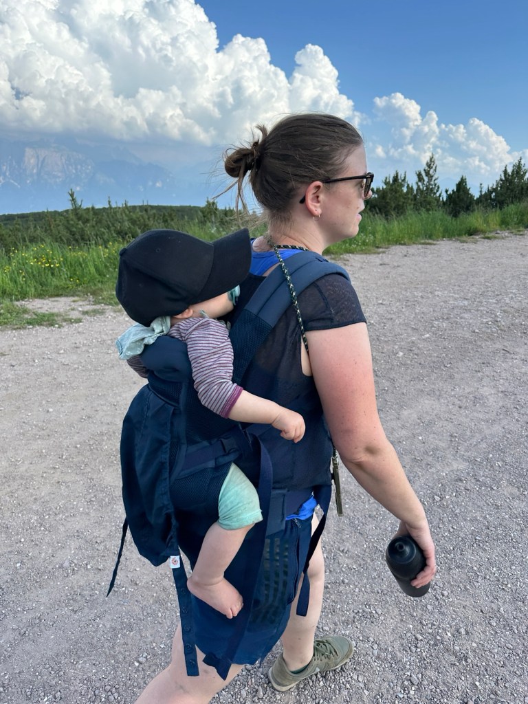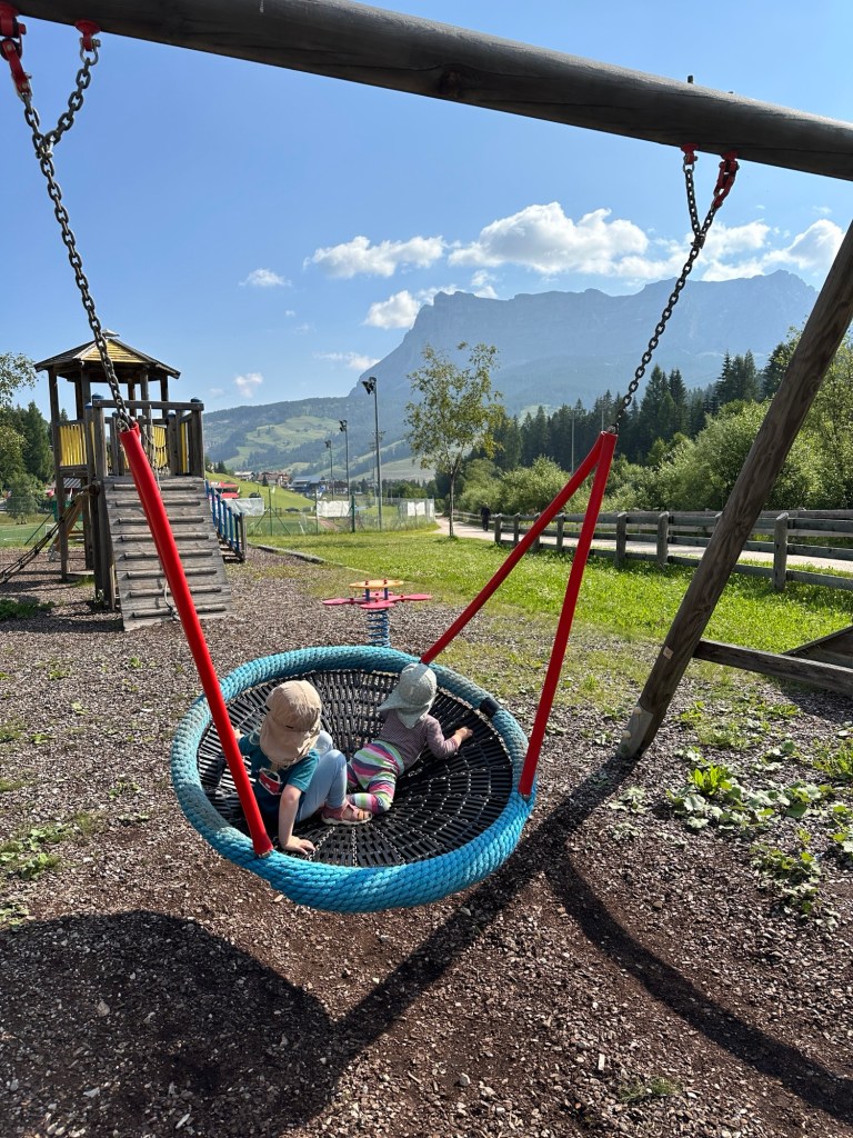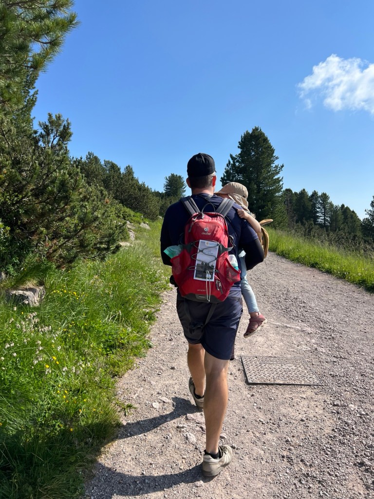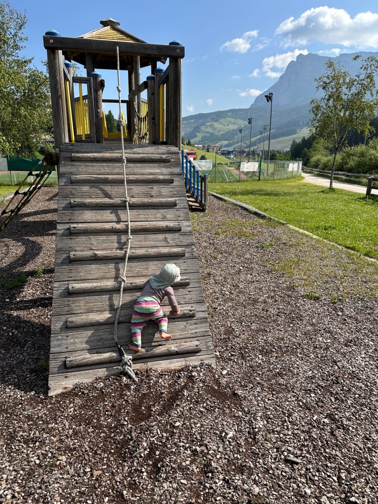 Die Große freut sich schon sehr auf die Seilbahnfahrt nach oben. Eine halbe Stunde packen lang und schon geht es los. Wir nehmen das kleine Set-up. Bodo nimmt den Rucksack mit Proviant und ich nehme die Kleine in die Trage auf den Rücken. Das wollte ich schon länger mal ausprobieren und nun bietet es sich an. Ich finde es super und die Kleine mag es auch. Da wir leider erst sehr spät angekommen sind, haben wir oben angekommen nur etwa 3 Stunden Zeit. Für eine Pause auf einer Hütte wird es also wahrscheinlich nicht reichen. Die Aussicht ist großartig! Wir haben Sicht über einen großen Teil der Dolomiten, können Gipfel aus der Ferne betrachten, die wir tagelang nur von unten sehen konnten. Damit haben wir hier nicht gerechnet. Auch das erste Klettergerüst überzeugt die Kinder und uns. Denn auch wir bekommen Lust auf dem riesigen Gerüst aus zusammengeschraubten Holzstämmen zu klettern. Die Kleine hält sich hier gern in den drei kleinen Trampolinen in der Mitte auf. Um aber noch mehr von dem Toni Pfad sehen zu können, ziehen wir weiter zur nächsten Station, wieder etwas zum Klettern. Wir laufen vorbei an einem See, dem schwarzen See, der so klar ist, dass man mehrere Meter tief schauen kann.
