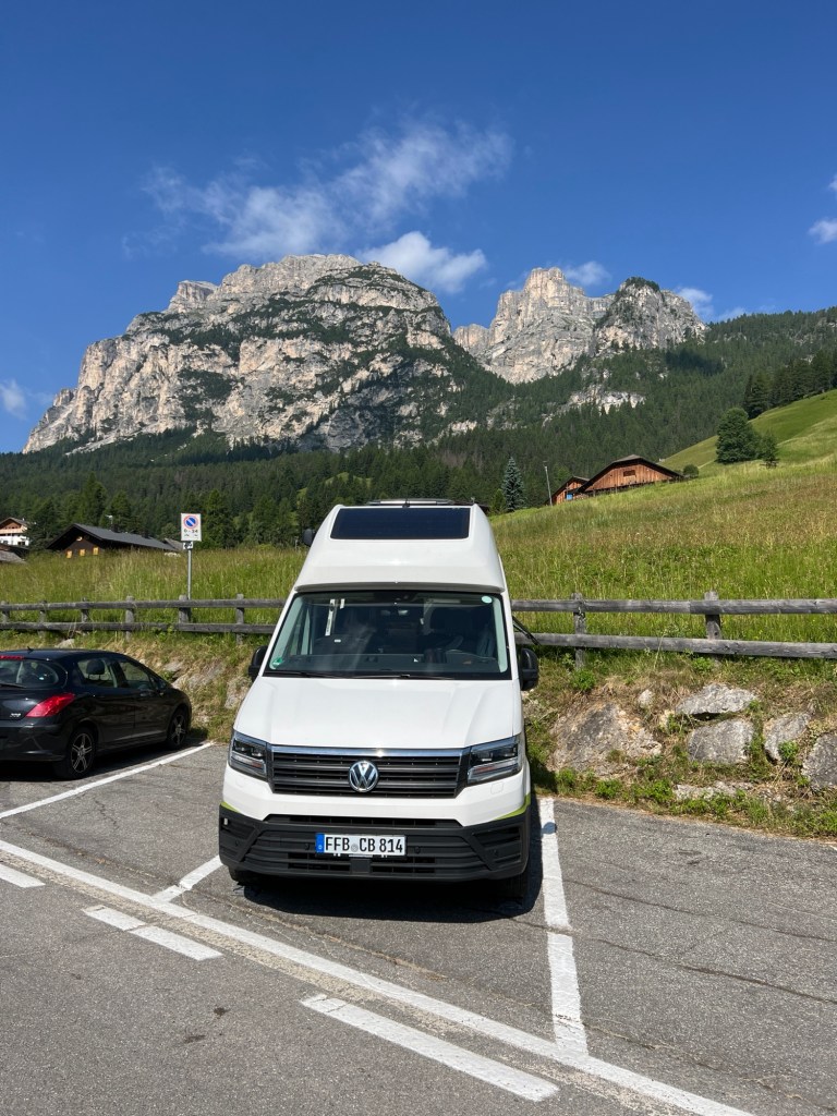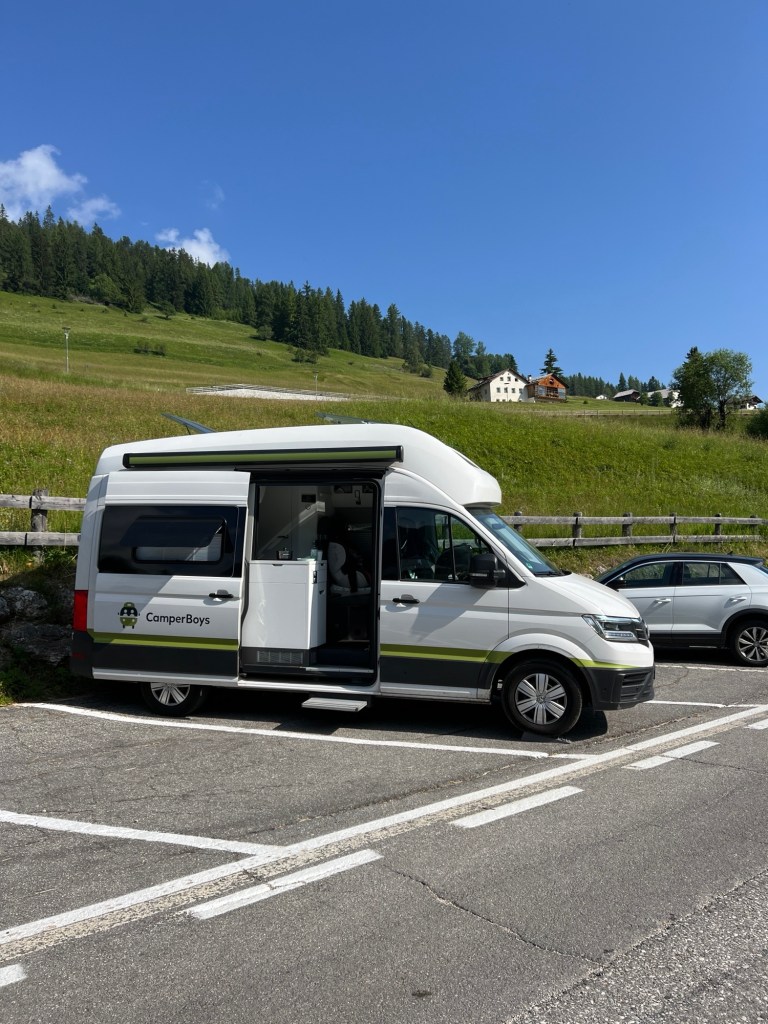 Wir brechen auf zur „sagenhaften Welt des Toni“ am Rittnerhorn. Ein Erlebnispfad, den Bodo als Zwischenstopp für die lange Fahrt zur nächsten Wanderregion in der Schweiz rausgesucht hat. Damit wir die Strecke nicht in einem Rutsch durchfahren müssen, war es Bodos Idee, diese durch familien- und vor allem kinderfreundliche Aktivitäten aufzulockern. Der Toni Pfad klingt vielversprechend, liegt allerdings auf einem Berg in der Ferne. Um ihn zu erreichen müssen wir die schönen Dolomiten hinter uns lassen. Hierfür gilt es mehrere Pässe rauf und wieder runter zu fahren. Ich fahre und Bodo liest etwas zu lange am Handy, während wir uns gerade 2000 hm einen Berg hinunterschrauben. Ihm wird dabei sehr flau im Magen. Wir machen die Fenster, auf aber das reicht noch nicht. Ein paar Laugen-Cracker sollen helfen. Aber wirklich besser wird es erst als wir auf der Landstraße unten im Tal sind und eine längere Strecke mal nur geradeaus fahren. Bis wir uns den nächsten Berg hocharbeiten und mal wieder unzählige Kehren bewältigen müssen, geht es ihm zum Glück schon wieder besser.