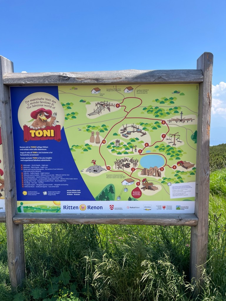 Wir lassen uns vom Navi des Campers lotsen soweit es das kann. Den Rest soll google Maps übernehmen. Wir fahren selten so unvorbereitet in eine Region, in der uns das Gelände bzw. die Wegführung unbekannt ist, aber die Zeit und die Kapazitäten fehlen uns, also rein ins Abenteuer und hallo Überraschung. Denn wir sind noch nicht am Ziel, als das Navi weiter möchte, uns die Beschilderung aber untersagt weiterzufahren. Doch der Ort sieht vielversprechend aus. Großer Parkplatz mit Bushaltestelle und Seilbahn Station. Ich schaue auf einer Karte nach und lasse mir bei der Seilbahn bestätigen, dass wir mit einer Fahrt nach oben zu unserem Ziel gelangen, zur „sagenhaften Welt des Toni“. Ein Erlebnis- um Erkundungspfad für die ganze Familie mit Wandermöglichkeiten, Spiel- und Kletterarealen, kleinem Wasserspielplatz, Kneipp-Becken und Hütten zur Einkehr.
