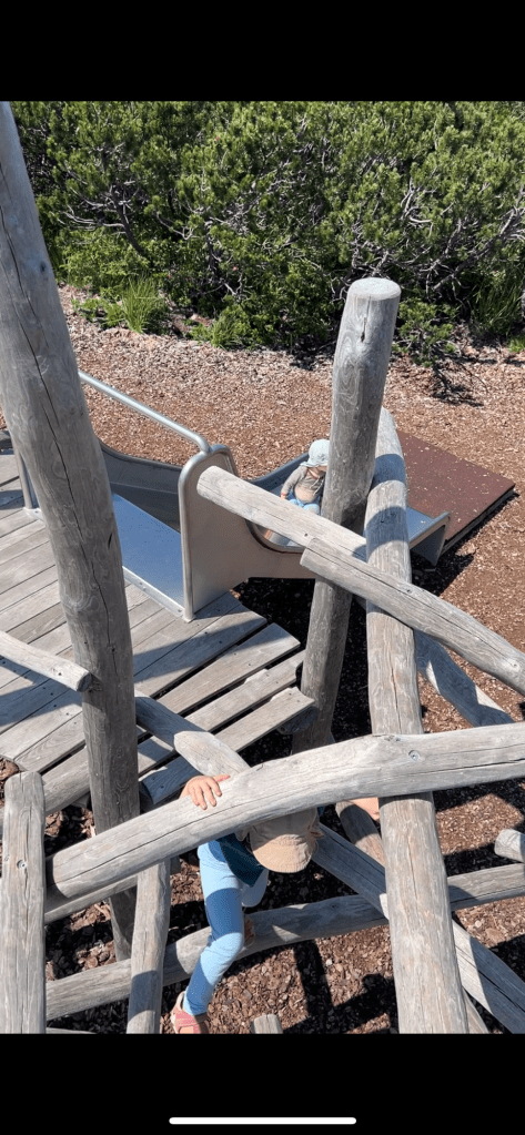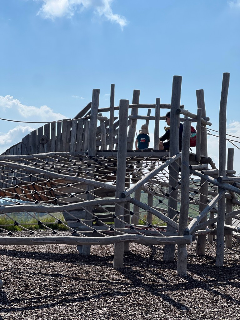 Die nächsten beiden Stationen sind eher unspektakulär und es folgt wieder ein großes Kletter Gerüst, ein riesiger Toni Adler aus Holzstämmen. Inzwischen habe ich die Kleine wieder auf dem Rücken in der Trage, denn sie ist müde. Bodo und ich klettern trotzdem wieder fleißig mit und spielen Rollenspiele mit der Großen. Sie ist Kapitänin und wir fahren mit ihr auf einem Schiff. Die riesige Röhrenrutsche lassen wir hinter uns, als wir weiter zu den letzten beiden Stationen ziehen, denn die große interessiert sich für Röhrenrutschen nicht. Die letzte Station ist eine Höhle, in die sie mit Bodo reingeht. Der Eingang ist eng und während die Große mit eingezogenen Kopf hineinstapft, versucht Bodo mit heilen Knien und heilem Kopf wieder herauszukommen.