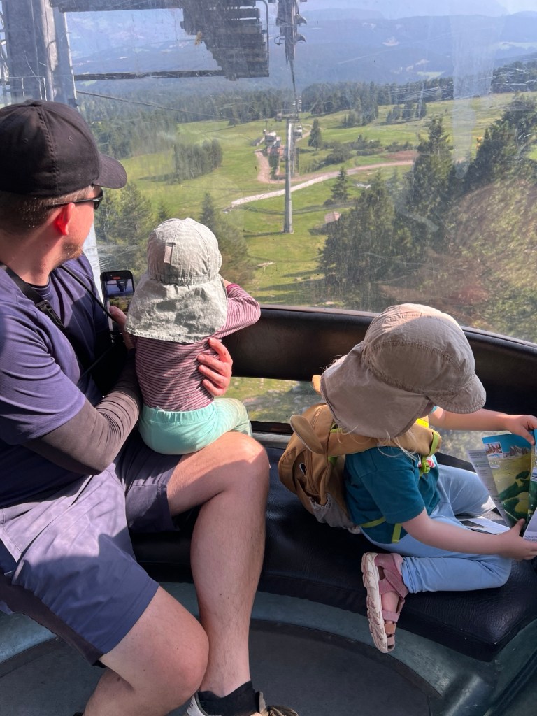 Wieder an der Seilbahn Station angekommen, bekommt sie noch 5 Minuten um zu rutschen, aber sie ist schon bereit für den Rückweg. Auf der Fahrt nach unten studiert sie dann ausgiebig die Karte, der Region und Bodo, die Kleine und ich genießen die großartige Aussicht. Am Auto unten angekommen ist die Stimmung sehr gut. Die Kinder und auch wir hatten einen schönen Tag. Wir entscheiden hier Abend zu essen, kochen gefüllte Nudeln mit Parmesan und machen die Kinder nach dem Essen bettfertig, damit sie auf dem Weg zum Stellplatz einschlafen können und wir sie dann nur umlagern müssen. Wir wollen schnell los kommen, denn der Parkplatz ist mit einer Schranke gesichert. Unser Ticket ist bereits bezahlt, aber unsere Sorge ist es, dass die Schranke ab einer bestimmten Uhrzeit nicht mehr auf geht, also wollen wir nicht die Letzten auf dem Parkplatz sein.