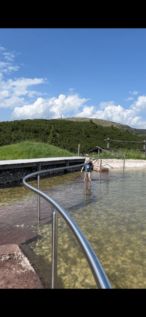 Weiter geht es zu einem Kneipp-Becken, dass Klein und Groß zum Plansch einlädt. Ich gehe mit der Großen rein. Uns gefällt es so gut, dass wir hiermit eigentlich den Rundkurs hätten abschließen können. Auch die Kleine will gerne rein und sie darf die Füße reinhalten und zappelt munter im Wasser herum. Aber bevor wir sie planschen lassen, ziehen wir weiter zum nächsten Punkt, einem Wasserspielplatz. Hier darf auch die Kleine mitmischen. Wir versuchen uns Zeit zu lassen, sind aber etwas getrieben dadurch, dass die letzte Gondel um 17:30 abfährt. Also weiter.