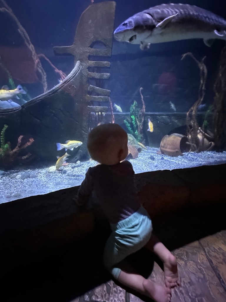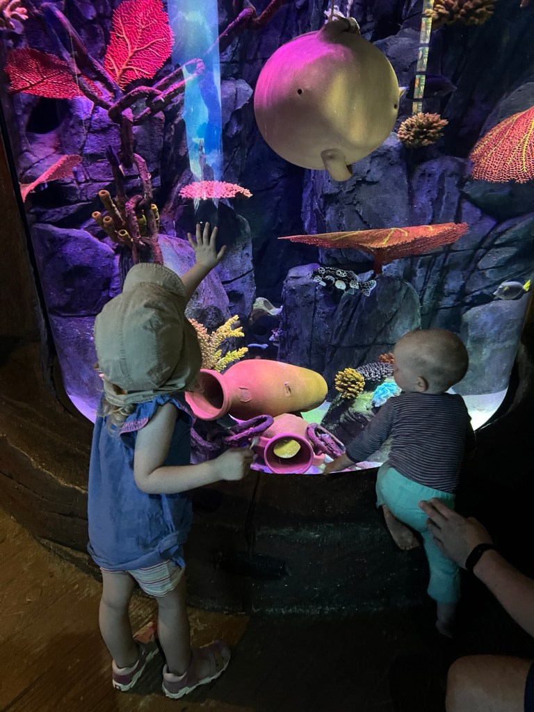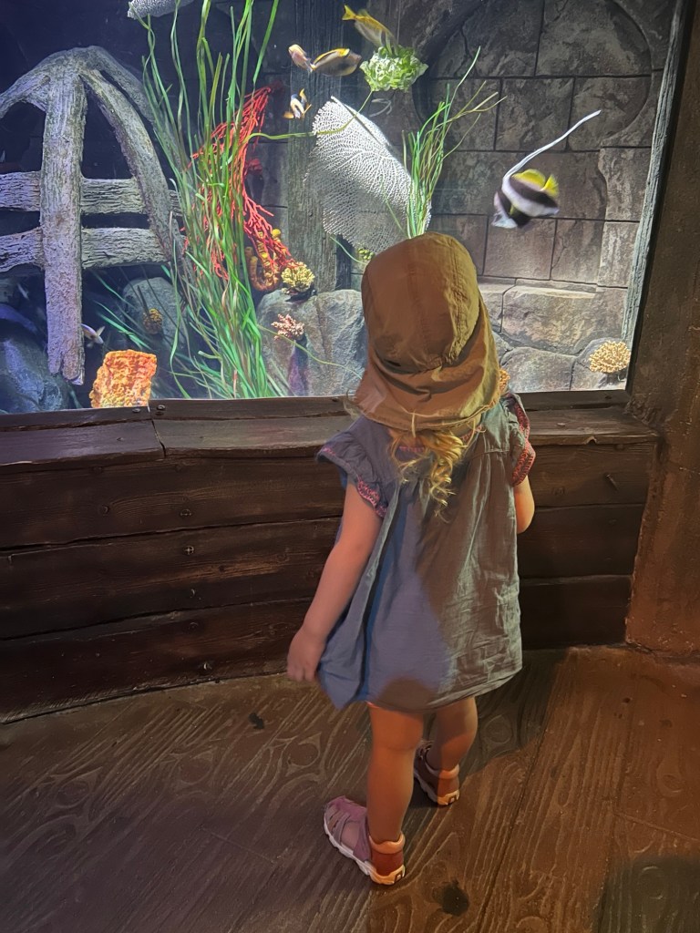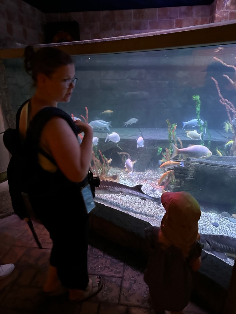 Im Aquarium ist es nicht besser, das Wasser läuft und die Luft steht. Die Kleine will die ganze Zeit runter auf den Boden, mal zum Krabbeln, mal, um an den Händen von Mama oder Papa zu laufen. Bei den klimatischen Bedingungen eine ganz eigene Herausforderung. Bei manchen Fischen quietscht die Kleine oder macht bellende Geräusche, ansonsten ist aber krabbeln und laufen am interessantesten. In dem Museum in Bozen, in dem wir vor kurzem waren, gab es auch Aquarien und die Große fand die Fische und Seesterne ganz toll, heute möchte sie meist schnell weiter. Es ist generell sehr dunkel gehalten und am Ende sagt sie, dass es erst dunkel war und dann hell wurde. Eine gute Beobachtung.