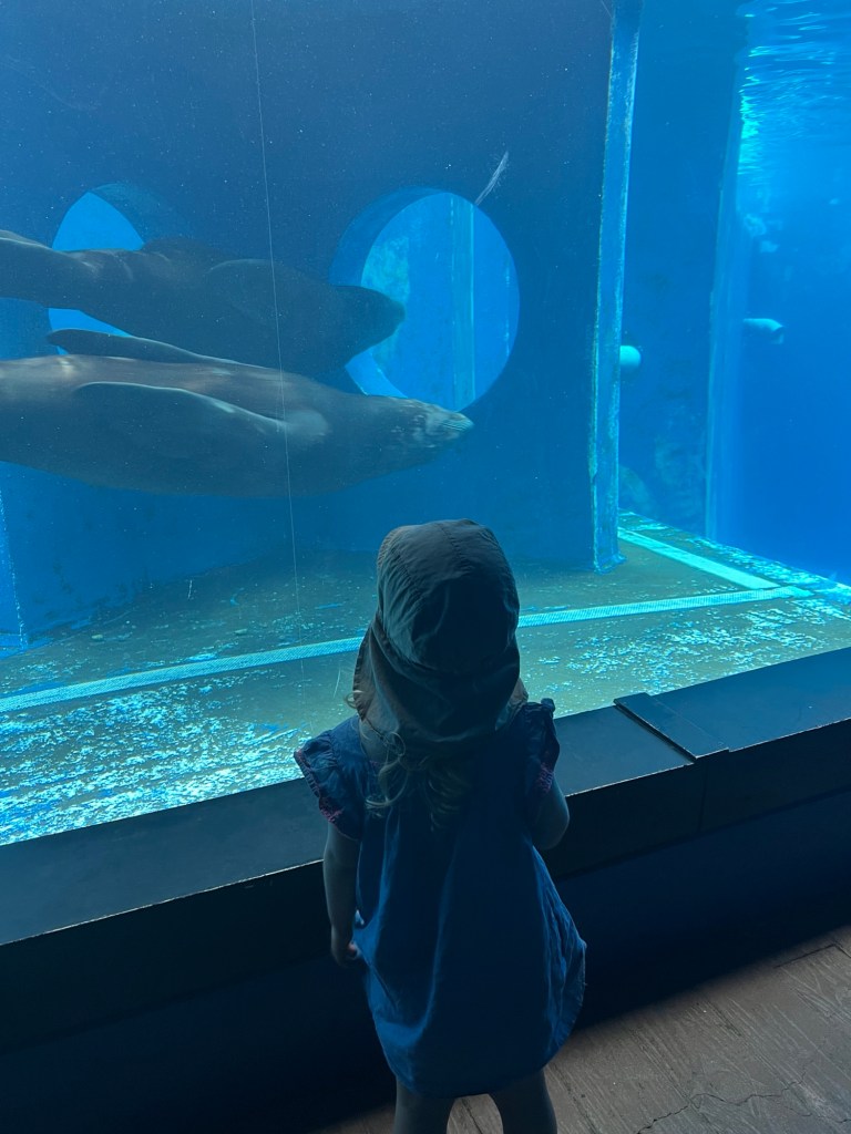 Vom Aquarium Teil wird man durch den Shop geleitet und gelangt dann ins Restaurant. Im Shop sind beide Kinder begeistert zwischen den Regalen unterwegs und nach dem Mittagessen sehen wir uns noch mit schlechten Plätzen die Seelöwen Fütterung an.