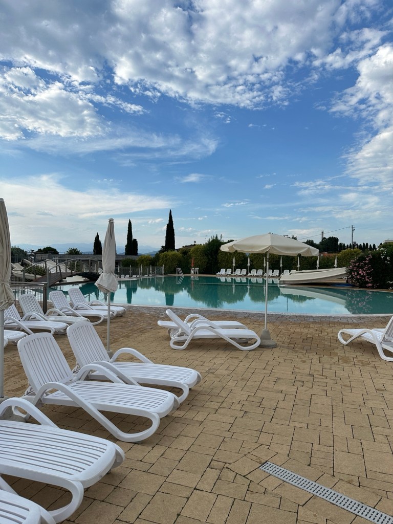 Wir gehen früh an den Pool, wir kaufen uns das Mittagessen im Camping Platz Restaurant und bleiben bis kurz vor Pool Schließzeit im Wasser. Alles steht auf Baden. Die Kinder feiern es total. Die Große traut sich in immer tieferes Wasser und macht ihre ersten Schwimmübungen mit Lu, die Kleine planscht im Sitzen und im Stehen und übt immer wieder das Laufen, am Ufer und im Wasser – egal, wie tief es wird. Sie kennt keine Gefahr. Da sie immer an den Händen von einem von uns läuft, ist das noch ungefährlich, aber sie krabbelt auch in Untiefen und da muss man einfach nur schnell genug sein. Einer von uns ist immer dediziert für ein Kind zuständig. Davon haben wir ein paar mal gehört und das ergibt total Sinn. Die volle Aufmerksamkeit ist bei den Kindern, bzw. einem Kind. Nicht am Handy daddeln oder so.