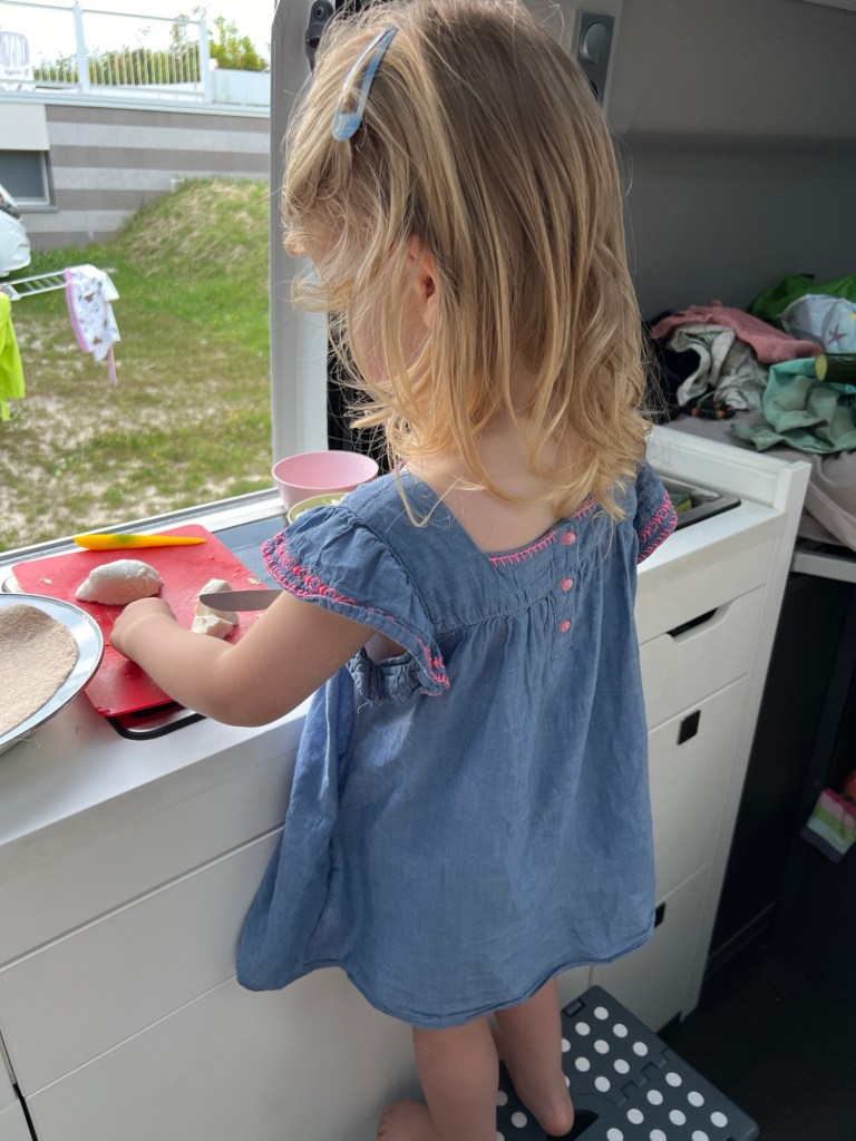 Frühstück und Abendessen gab es weiterhin am Camper und da war auch schnell mal dicke Luft, weil die beiden gerade erst kennenlernen, wie es ist, sich so wenige Dinge und so wenig Raum zu teilen. Die Große hat ihre Home Base auf ihrem Kindersitz gefunden und zieht sich oft dort hin zurück, zum Lesen, Malen und Musikhören, aber die Kleine respektiert Räume noch nicht und will immer mit ihrer großen Schwester spielen, die das wiederum oft lautstark ablehnt. Die Kleine denkt, da beginnt das Spiel „wir sind jetzt laut“ und macht mit. Und hier schließt sich der Teufelskreis. So auch auf dem Campingplatz und das nicht nur im Camper.