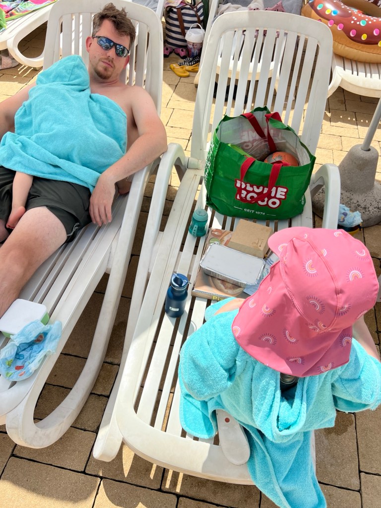 Wir sind eigentlich die gesamte Poolzeit nur an einem Pool, dem Pool für Kleinkinder und Nichtschwimmer. Er hat eine Rutsche und Lu und ich sind beide ein paar mal gerutscht, die Große möchte nicht und die Kleine … na ja, die ist noch zu klein. Aber sie würde es womöglich gerne machen. Es gibt noch eine Mini Rutsche im flachen Teil des Wassers und die beiden lieben sie. Rauf, runter, rauf, runter. Die Große nutzt die Rutsche am liebsten rückwärts, also Rutsche hochklettern, Treppe runterlaufen und die Kleine läuft an Händen immer bis zur ersten Stufe, wird dann abgesetzt, klettert alleine hoch, rutscht dann wieder an den Händen runter und freut sich dabei riesig. Sucht mal nach „Benny Hill Theme“, dann könnt ihr euch eine Vorstellung machen, wie diese Rutsche bespielt wurde
