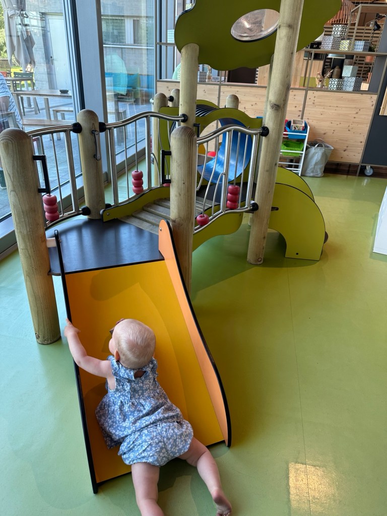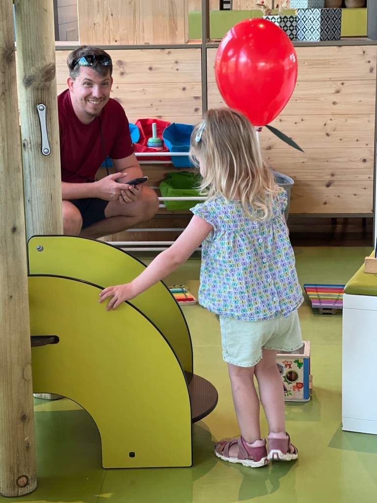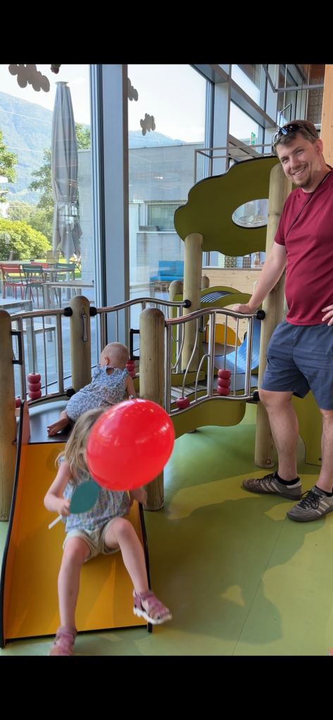 Es ist Zeit für ein Mittagessen und wir finden in der Schweiz einen Rastplatz mit Marché Filiale und beschließen dort Rast zu machen. Die günstigste Variante Geld loszuwerden. Das Marché hat sowohl draußen, als auch drinnen Spielmöglichkeiten und die Kinder stürzen sich direkt darauf. Nach kurzer Spielzeit suchen wir uns Speisen aus und setzen uns zum Essen an einen sogenannten Familientisch. Das Tolle ist, dort steht sogar eine Mikrowelle und wir können den Brei für die Kleine erwärmen. Warm schmeckt er ihr zu Hause auch besser.