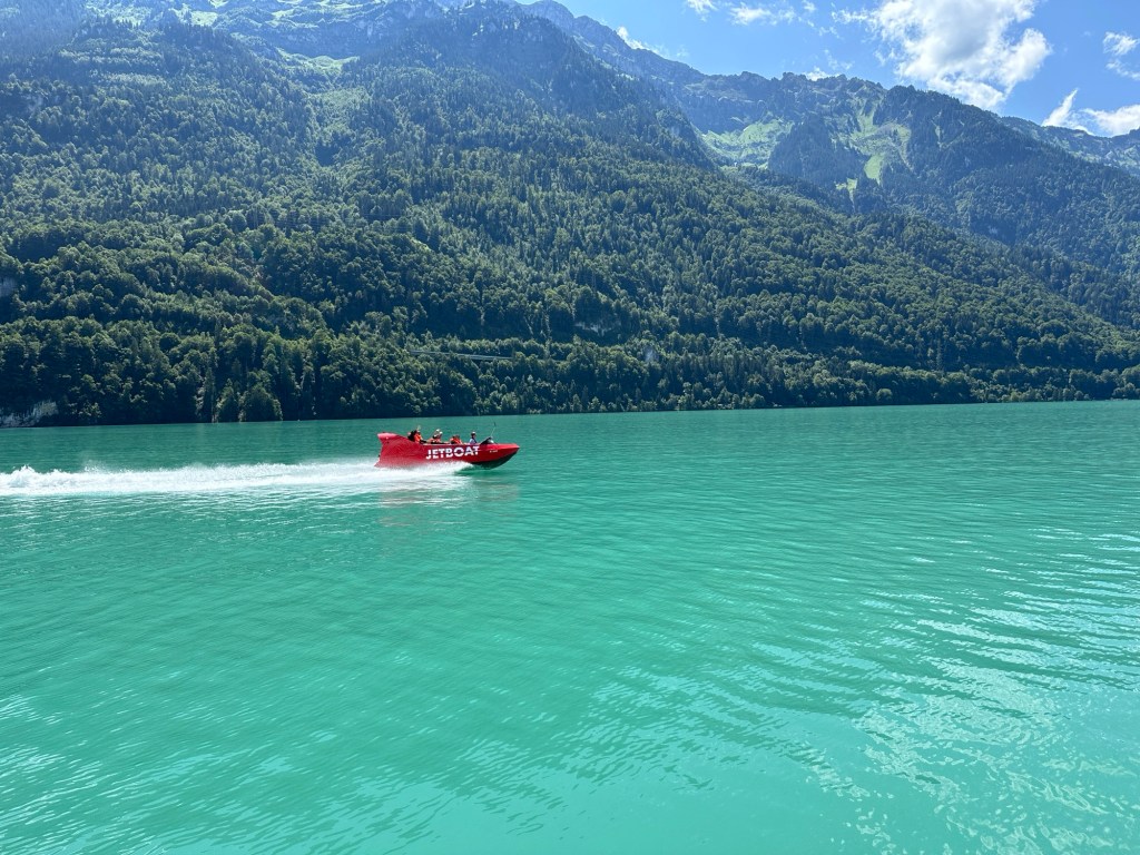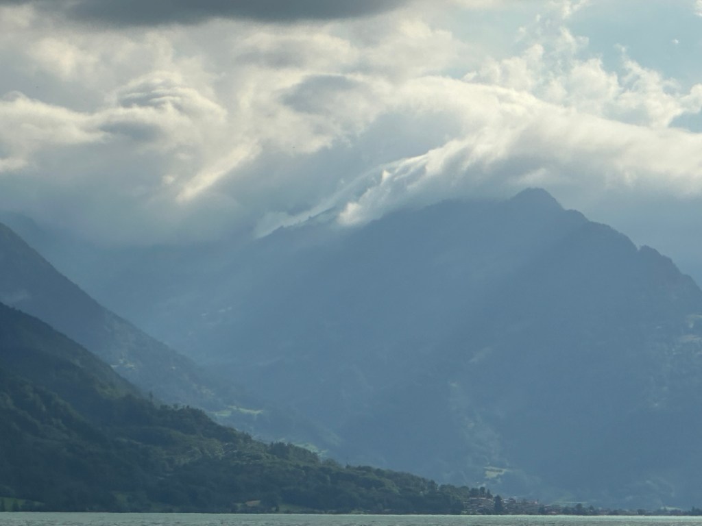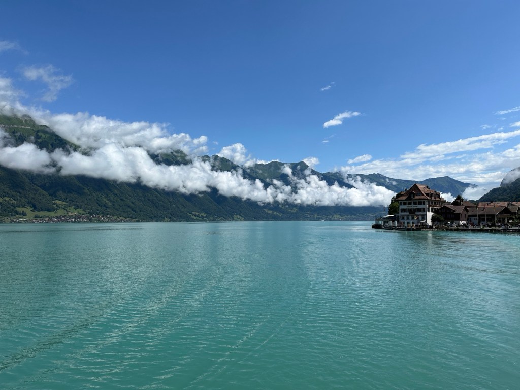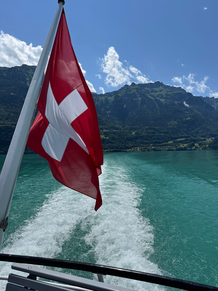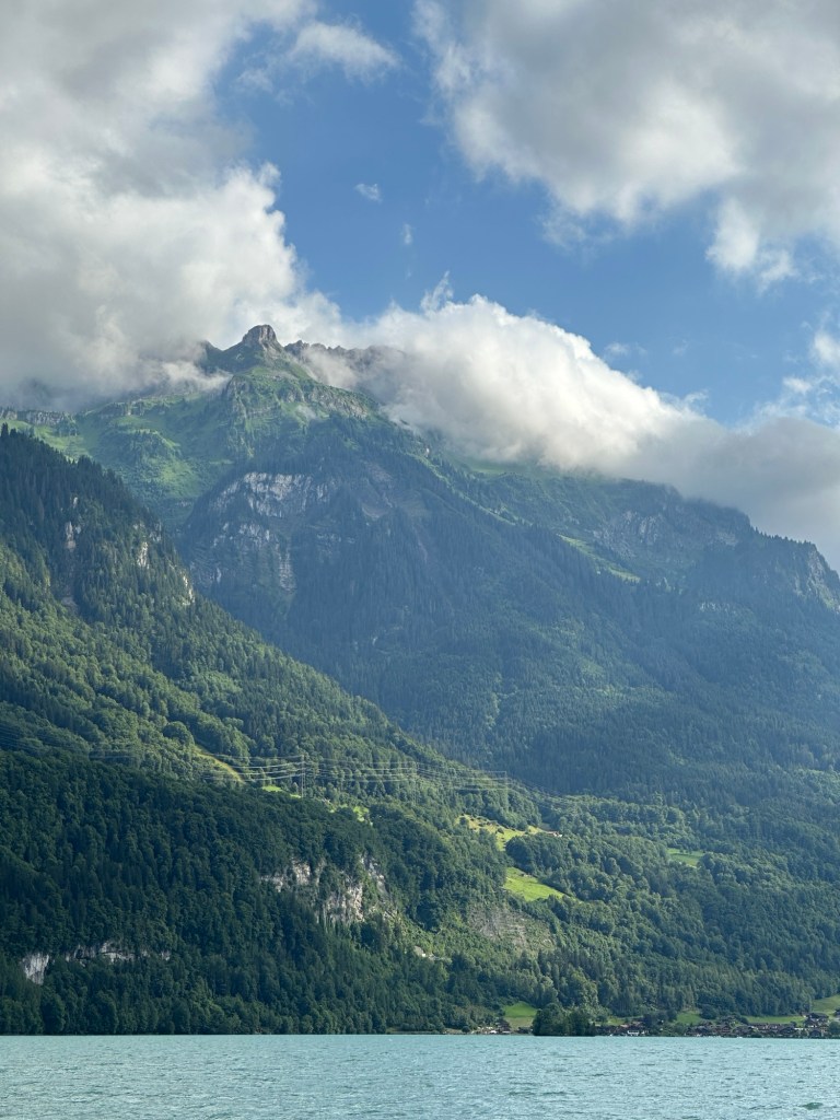 Als wir nur wenige Minuten später das ankommende Schiff betreten, geht Bodo mit den Kindern auf dem hinteren Deck einen Platz suchen. Dass wir auf dem falschen Schiff sind, merke ich während ich am Service-Schalter anstehe, um Tickets für uns zu kaufen. Denn wir fahren in die falsche Richtung. Statt nach Osten, geht es nach Interlaken auf der westlichen Seite des Sees. Ich habe die Hoffnung , dass wir trotzdem nur das Ticket zahlen müssen, dass wir brauchen, aber wir müssen leider die Fahrt in die falsche Richtung, plus die Fahrt vom viel weiter entfernten Interlaken nach Brienz zahlen. Da ein Ticket für eine Rundfahrt günstiger ist als beide Einzelfahrten, kaufe ich Rundfahrt Tickets für uns. Dadurch kostet die Fahrt für beide zusammen 134 € anstelle von 84 €. Wir fahren also zuerst nach Interlaken und dann nach Brienz.