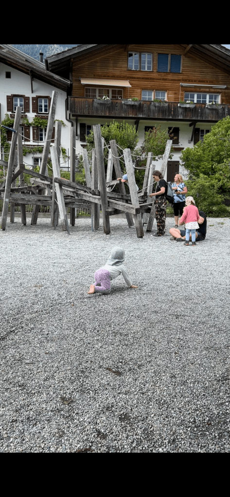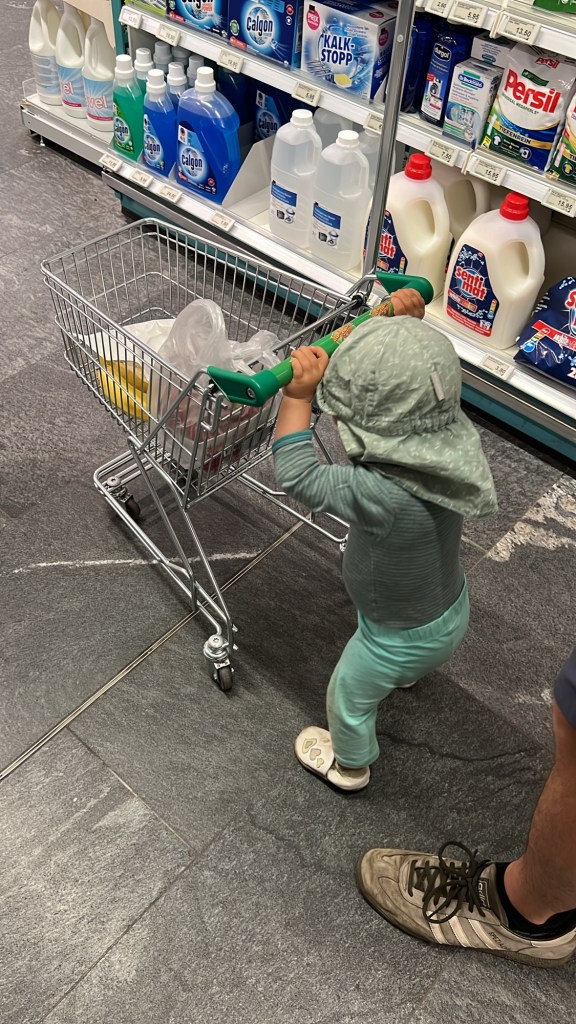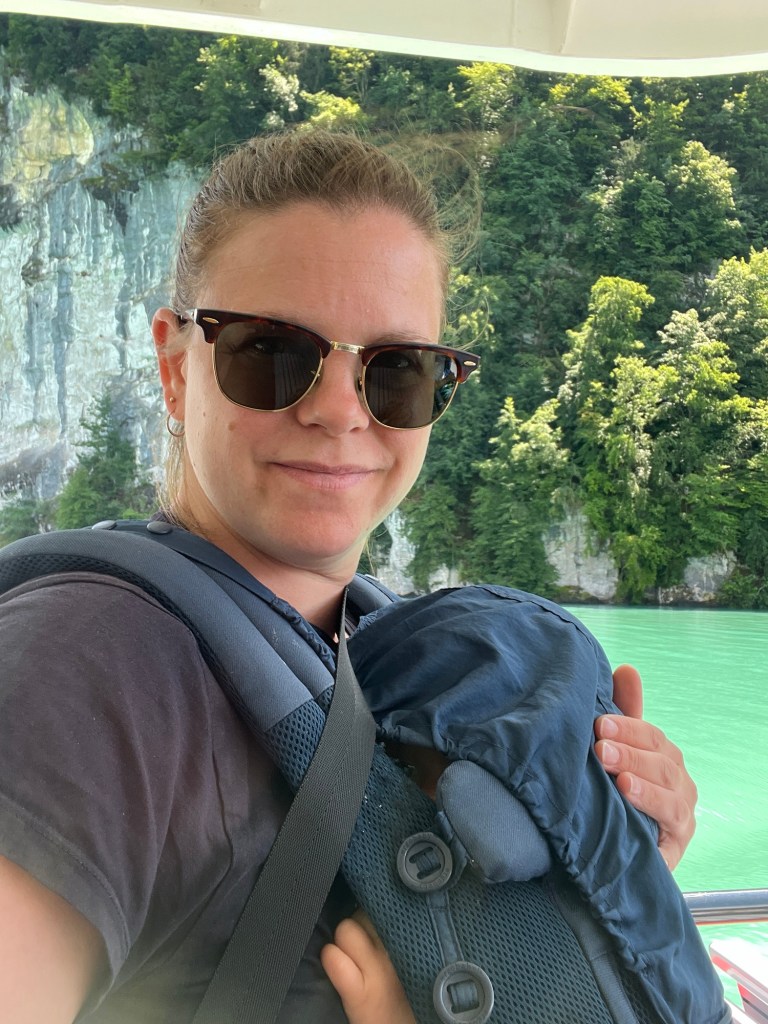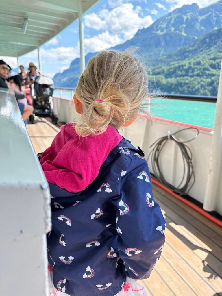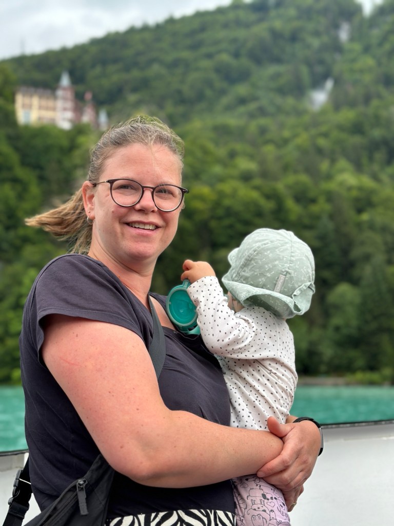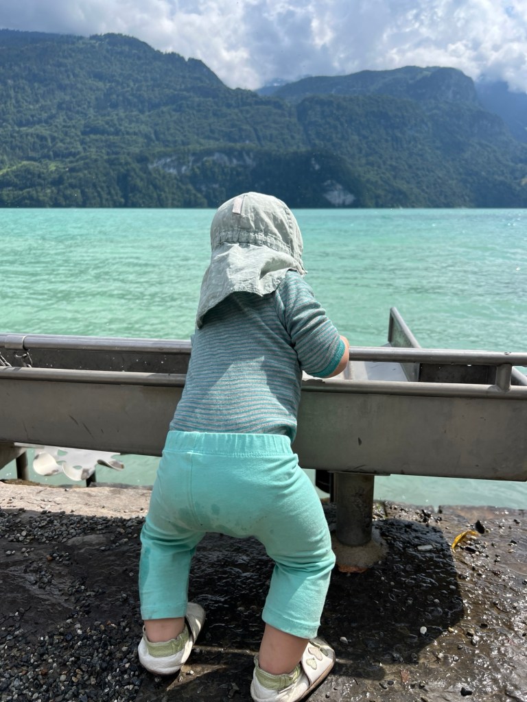 Als das Schiff in Interlaken anlegt, ist es schon Mittag und die Kleine mag nicht mehr laufen und ist auch sonst zu müde, um die Umgebung zu erkunden. Wir stellen fest, dass wir ihren Schnulli vergessen haben. Ich nehme sie in die Trage und sie fängt direkt bitterlich an zu weinen. Ich laufe außen am Schiff von Deck zu Deck und werde von den Fahrgästen beobachtet. Anfangs laufe ich eine Runde, doch am Land sieht die kleine Kühe und diese begeistern sie so sehr, dass sie mir beinahe aus der Trage klettert. Also bleibe ich auf der unspektakulären Seite des Schiffs. Das Geschrei ist über das gesamte Schiff zu hören. Sie macht immer häufiger Schreipausen, im denen sie fast einschläft. Das ganze dauert vermutlich 5-10 Minuten, fühlt sich aber natürlich wie eine Ewigkeit an.