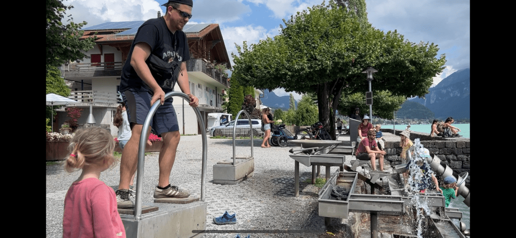 Wir machen uns auf den Weg zur Brienzer Uferpromenade. Sie ist sehr schön und lädt an vielen Stellen zum Verweilen ein. Es gibt viele Spielmöglichkeiten für Kinder, außerdem die Möglichkeit, sich Liegestühle zu nehmen, um sich ans Wasser zu setzten, wo man mag. Wir schaffen es bis zu einem sehr beliebten Wasserspielplatz mit direktem Zugang zum See. Bodo wickelt noch schnell die Kleine und die Große und ich beginne genüsslich das Eis am Wasser zu essen. Aber auch für den Papa bleibt noch genug übrig. Das ist der Großen wichtig. Dann dürfen alle mal auf den Wasserspielplatz und etwas planschen.