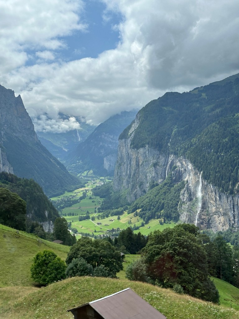 Nach der Talfahrt laufen wir durch das von Touristen überflutete Lauterbrunnen. Ich weiß, wir sind auch Touristen und machen die Situation nicht besser. Aber es ist schon bemerkenswert, wie diese Touristen Hotspots nicht von Themenparks zu unterscheiden sind. Lauterbrunnen macht auf uns einen amerikanisch angehauchten Eindruck. Die Läden heißen Food Point Kebab, Mountain Ice Cream, The Bell, Airtime Cafe Bakery und Flavours. Es hängen Ventilatoren auf den Terrassen, Geschäfte bieten Winter- und Wanderkleidung an und irgendwie erinnert es uns an Orte, wie Jackson in Wyoming, kurz vor dem Yellowstone National Park. Dort haben wir tatsächlich 2016 unsere Wanderschuhe gekauft, weil wir bemerkt haben, dass wir nicht gut ausgestattet waren. Wir tragen heute dieselben Schuhe und durch die Anekdote, die an unseren Schuhen hängt, trage ich sie noch lieber.