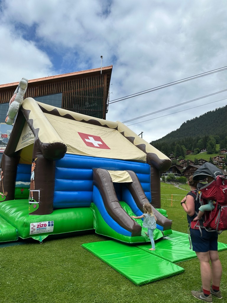 Direkt neben der Gondelstation ist eine Hüpfburg aufgebaut. Alles im Alpenlook, mit aufgedruckten Alphornbläsern und ganz oben am Dach lächelt eine schwarz-weiße Kuh. Die Große sieht die Hüpfburg sofort, als wir an der Station ankommen und verkündet freudig, dass sie darauf hüpfen möchte. Nach dem Ticketkauf gehen wir direkt zu Hüpfburg und lassen die Große darauf los. Sie hüpft und purzelt und rutscht zwischen einigen anderen Kindern und kommt mit einer Minute verbleibender Spielzeit bereits zurück zu uns. Sie hat genug und ist glücklich und zufrieden.