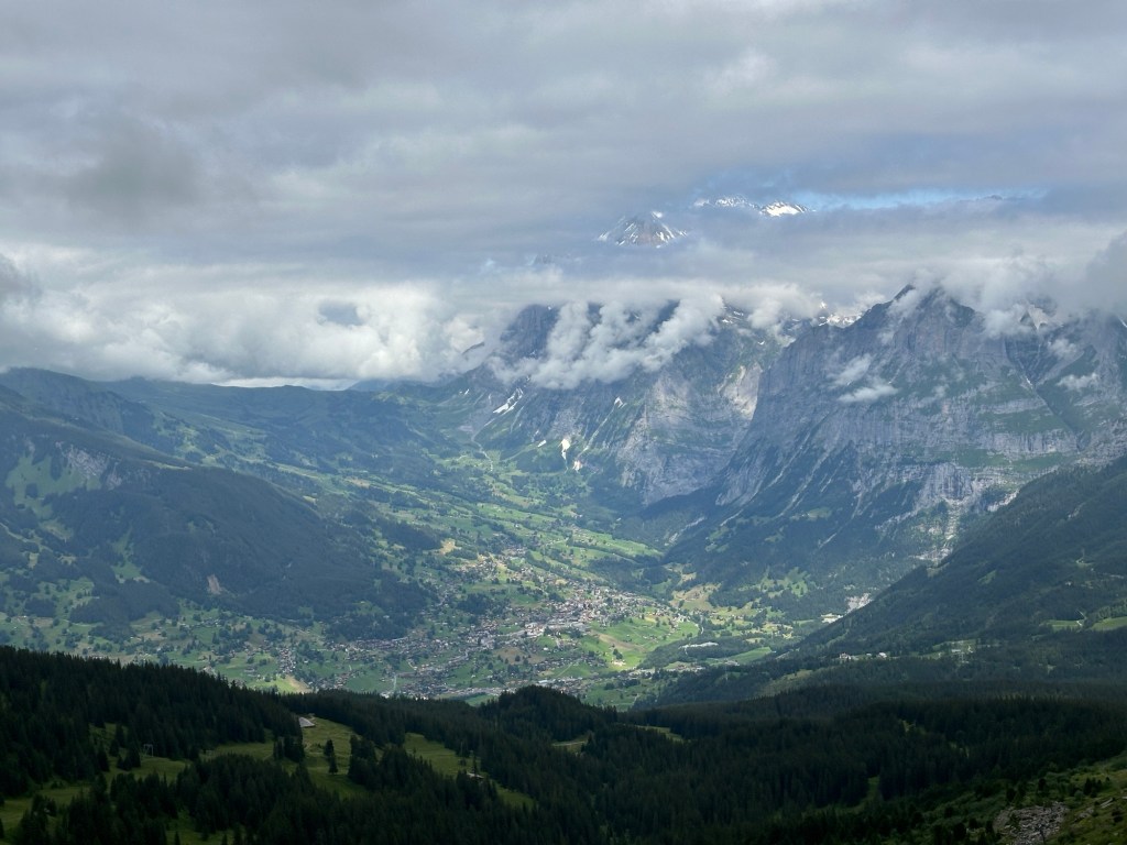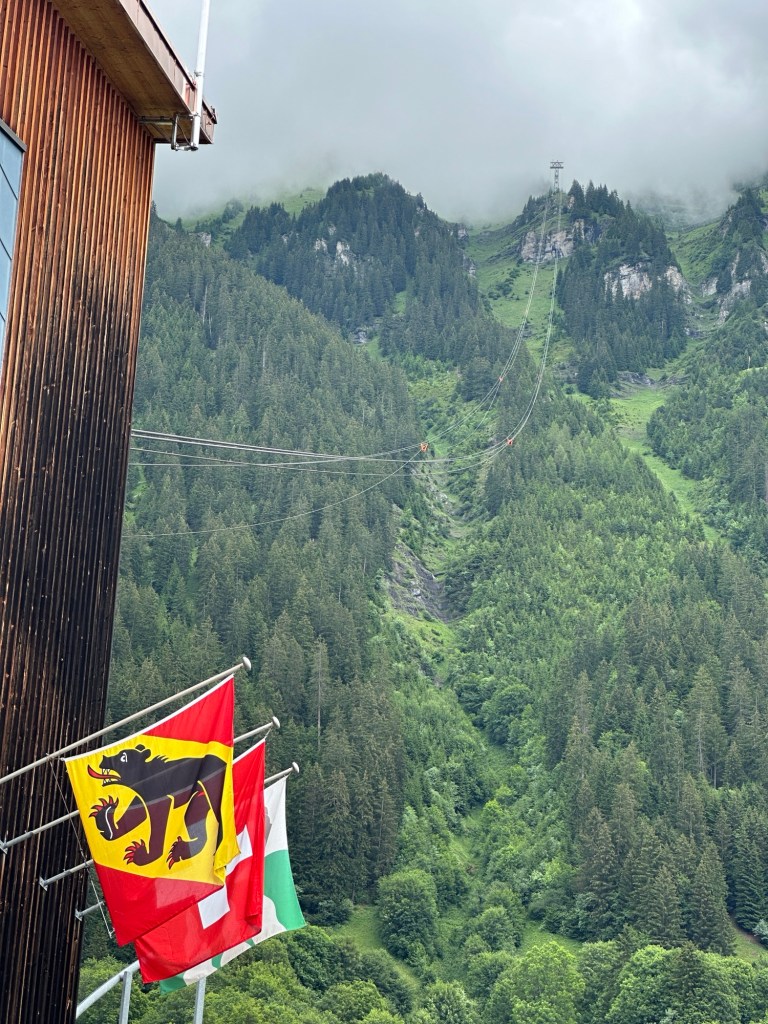 Wir starten wieder in Iseltwald. Heute wollen wir wieder wandern. Zwischen Grindelwald und Lauterbrunnen liegt der Berg Männlichen. Von ihm aus haben wir schon eine tolle Sicht auf die umliegende Jungfrau Region genossen. In der Kombination klingen die Namen schon sehr seltsam. Jedenfalls sind Eiger, Mönch und Jungfrau als Dreiergruppe vom Männlichen aus sehr gut zu sehen. Wenn es das Wetter zulässt. Heute ist der Himmel wolkenverhangen. Die Fahrt mit der Panorama Zahnradbahn von Lauterbrunnen hoch nach Wengen bietet noch viel Weitsicht und eine schöne Szenerie. Von Wengen aus geht es aber mit einer Gondel noch weiter hoch und die Seile der Gondel enden in der Wolkendecke. Von dort oben werden wir wohl heute nicht sonderlich viel sehen. Wir kaufen die Tickets und haben noch etwas Wartezeit, weil die Gondel nur dreimal pro Stunde fährt.