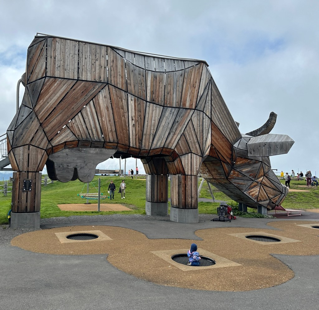 Über eine Treppe gelangen wir in den … Hintereingang der Kuh. Innen hängen Schaubilder, Spiele zur Verdauung der Kuh und Kuhglocken, die von Kindern in ohrenbetäubender Lautstärke gespielt werden. Ganz oben bietet eine Plattform eine gute Übersicht über den Spielplatz und die Wolkenlandschaft und als ich mit der Kleinen fertig gekundschaftet habe, rutschen wir durch das Maul der Kuh, durch eine Röhrenrutsche runter. Vor dem Rutschen drehe ich sie mit ihrem Gesicht zu mir, damit sie sich sicherer fühlt. Unten angekommen lacht sie herzlich.