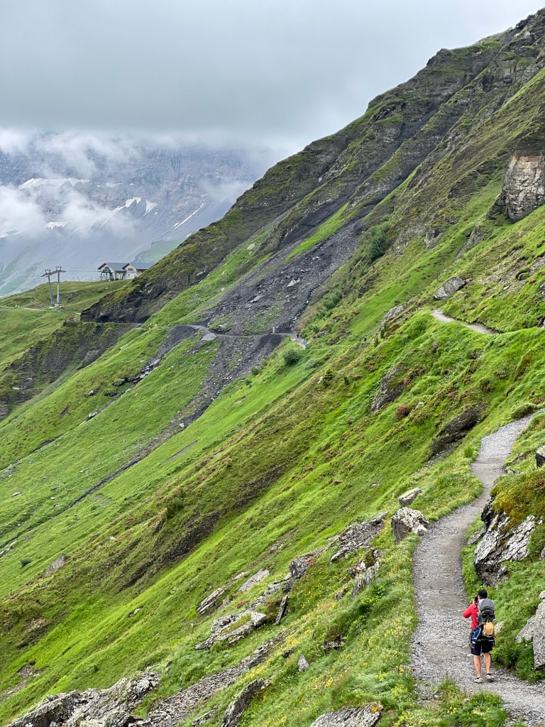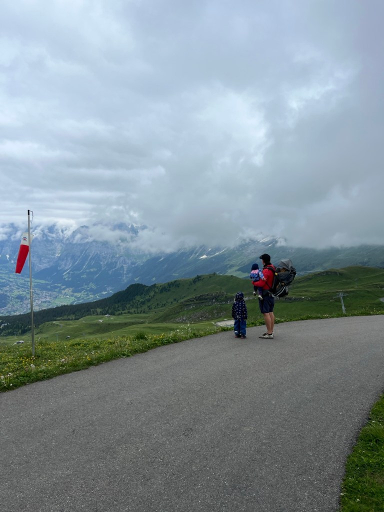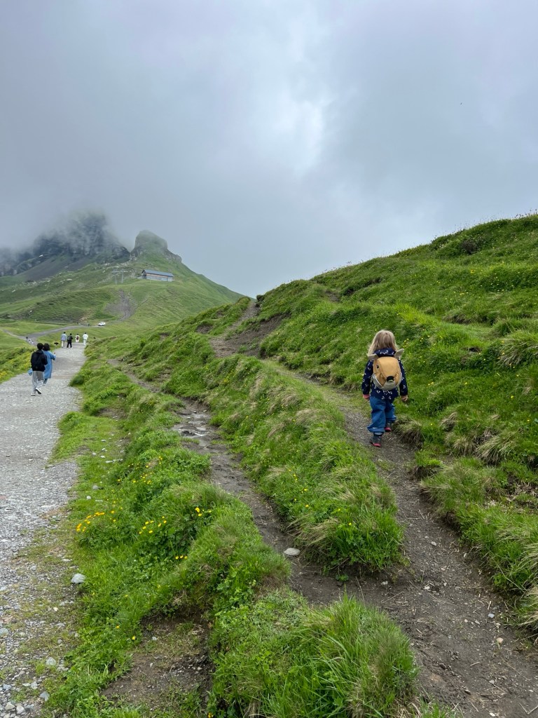 Die Große stellt fest, dass sie die anderen Besucher hier oben nur als dunkle Gestalten im Nebel erkennen kann. „Da laufen schwarze Menschen“. Sie tauchen irgendwo aus der Nebelwand auf und verschwinden irgendwo in ihr. Von der Bergstation aus gibt es einen Weg auf die Bergspitze des Männlichen, aber aufgrund der Sichtverhältnisse streichen wir das direkt und laufen weiter in Richtung kleine Scheidegg und Eiger.
