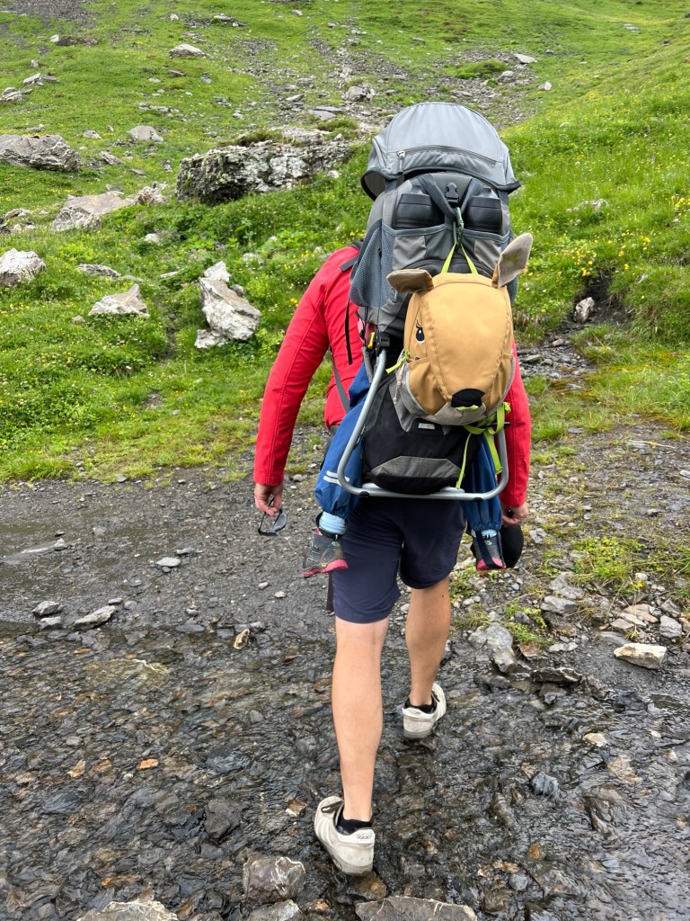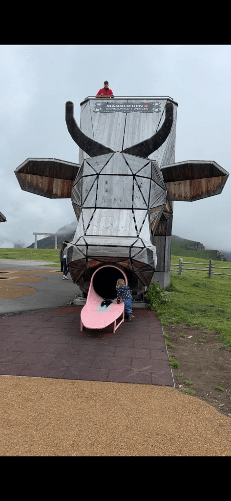 Wir hatten die große motiviert für die Wanderung, indem wir ihr versprochen haben, dass es oben eine Überraschung gibt. Sie hatte schon erraten, dass es sich um einen Spielplatz handelt. Nach wenigen Gehminuten von der Bergstation aus, trafen wir auf eine haushohe, begehbare Kuh. Hier ist der Beginn des Themenweges Liselotteweg. Der sogenannte Sennenspielplatz Männlichen lädt zum Verweilen ein. Für die Kinder gibt es allerhand Spielmöglichkeiten auf dem weitläufigen Areal und, wenn es das Alter der Kinder zuließe, könnten wir uns bequem auf die Terrasse des Berghaus Männlichen setzen. Unsere Kinder, 1 und 3 Jahre alt, erfordern aber unsere Anwesenheit und unser Mitspielen und so klettern wir auf Schwebebalken, spielen Bowling und hüpfen auf Trampolinen.