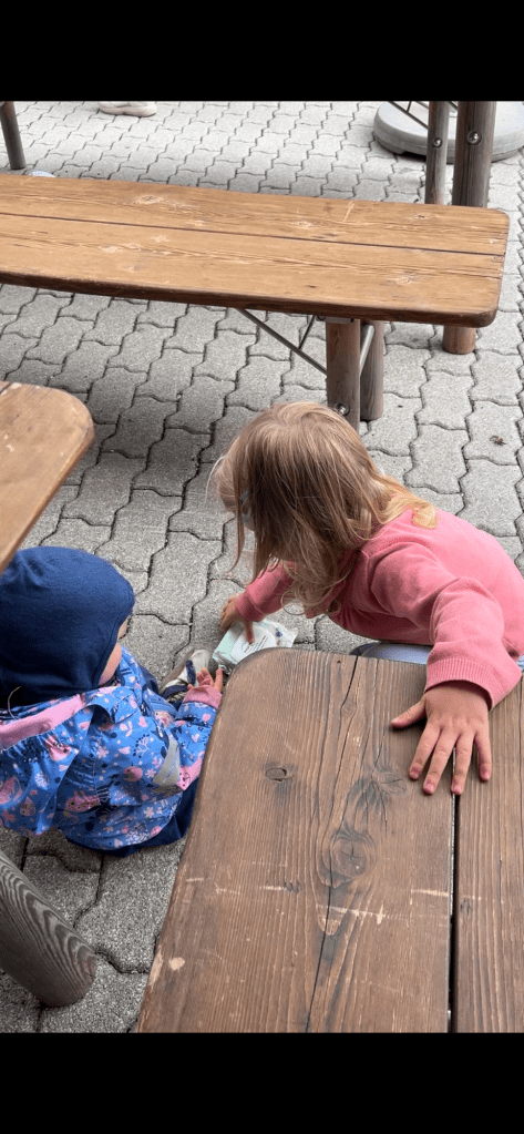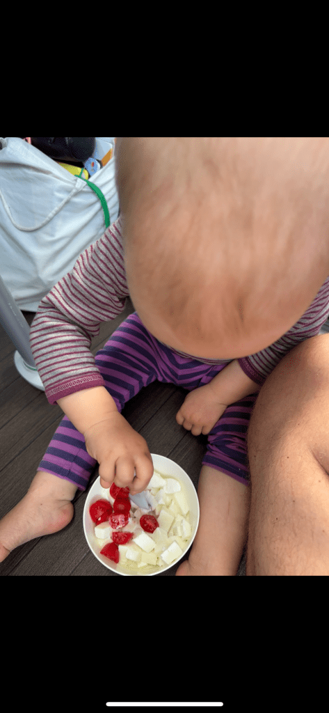 Wir spielen eine ganze Weile hier und bevor wir weiterziehen, gibt es noch einen Snack. Die Kleine liebt aktuell Banane und ist meist sehr enthusiastisch, wenn es etwas zu essen gibt. Aus „nomnomnom“ ist mittlerweile „am am“ geworden und zu Banane sagte sie schon „nana“. Bald wird sie Ansprüche ans Essen verkünden können, bevor wir es ihr hinhalten, damit sie es mit „Nein“ oder „am am“ kommentieren kann.