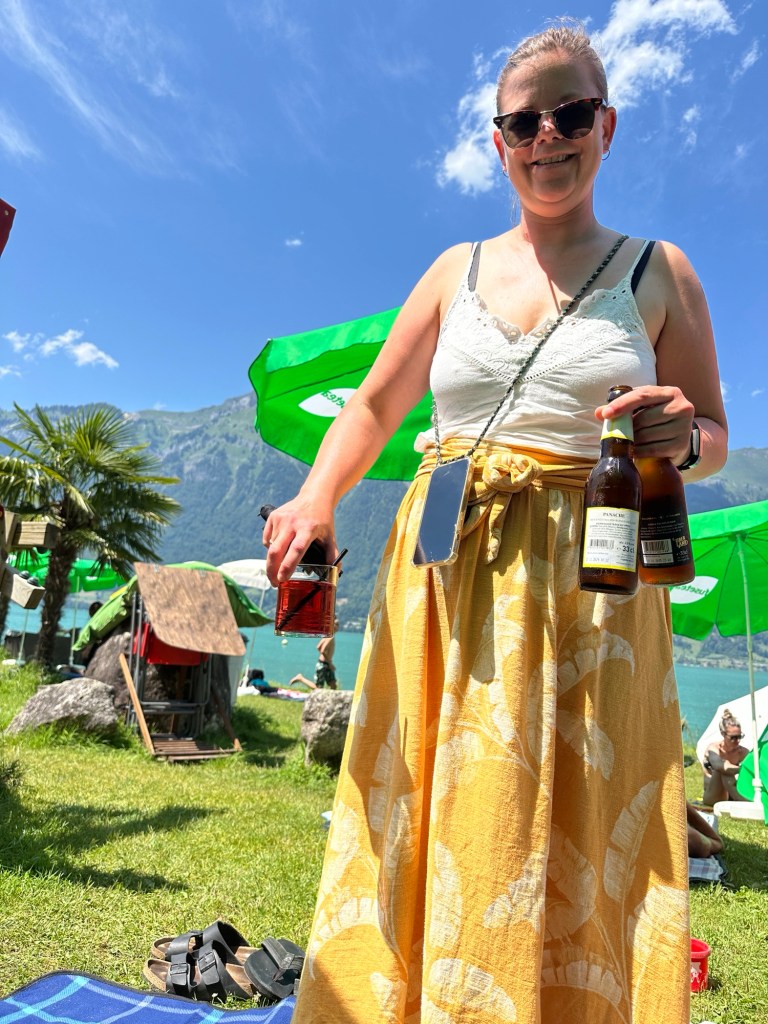 Nach den ersten Getränken machen wir uns alle fertig für einen sonnigen Tag: Badesachen an und eincremen. Wir haben heute bestes Schweizer Badewetter.