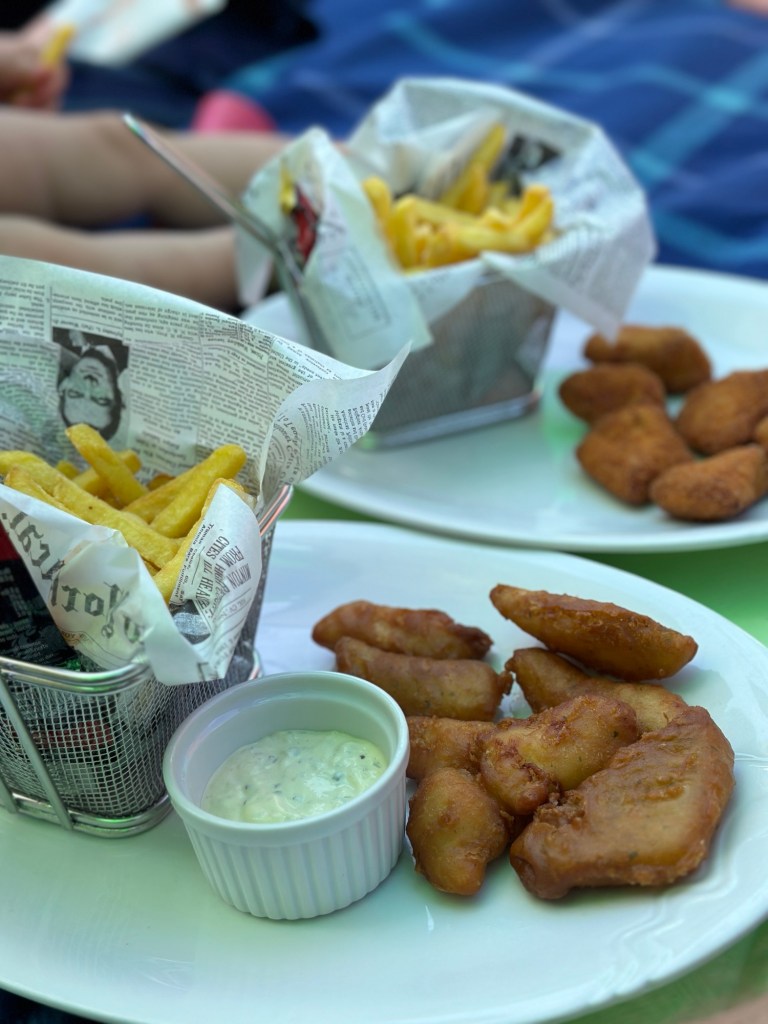 Wir suchen uns einen Platz auf der Wiese, stellen uns noch zwei Sonnenschirme dazu und Lu holt uns erstmal etwas zu trinken. Ein Bier, ein Panache (Radler) und ein Sirup (Wasser mit einem Sirup gemischt, in diesem Fall Himbeergeschmack). Alles zusammen rund 20 €. Später gibt es noch Fish and Chips und Nuggets mit Pommes für rund 50 € – wir lassen es uns heute richtig gutgehen. Dabei habe ich noch nicht mal Geburtstag. Aber es ist unser letzter Tag hier in der Schweiz und heute wird die Seele gestreichelt. Später gibt es noch Eis für Lu, mich und die Große und eine Cola und einen Saft, nochmal 20 € und jede Menge Zucker-High. Also, dafür, dass das Strandbad kostenlos ist, konnten wir doch einen beträchtlichen Teil unseres Budgets hier lassen.