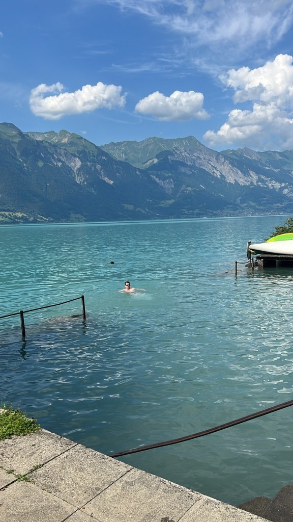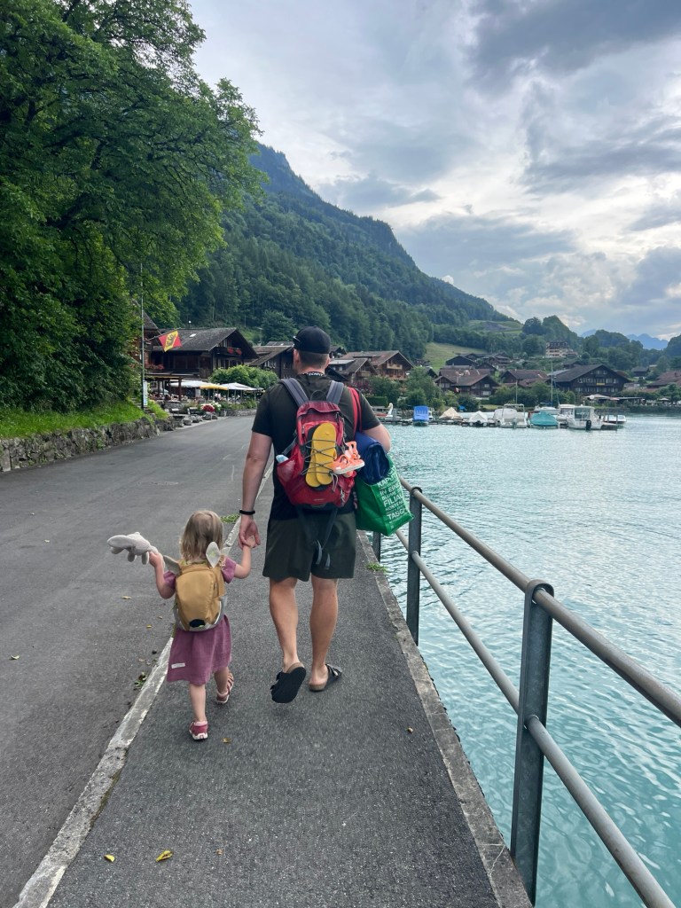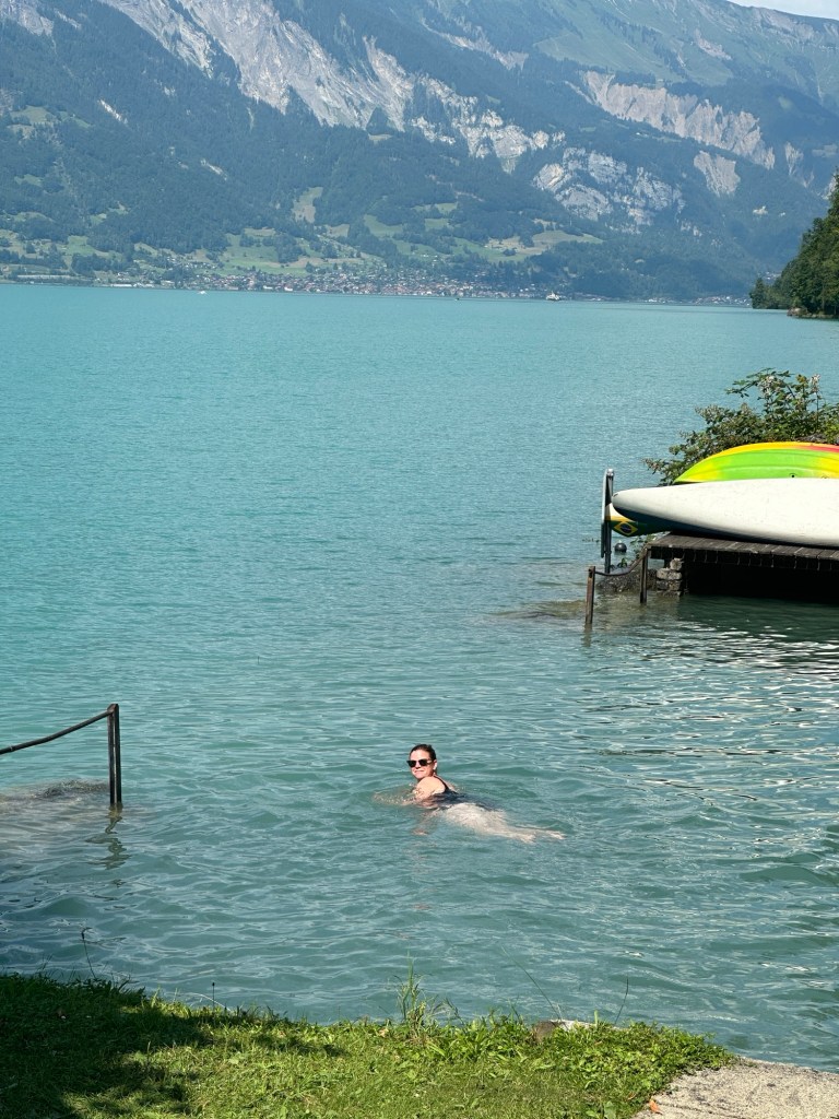 Wir sind fast am Ende unserer Camper Reise angekommen. Auch wenn wir auf der gesamten Reise weniger wandern waren, als wir gedacht hatten und es hier in der Jungfrau Region noch viele schöne Wanderungen gibt, sind wir uns einig, dass unsere Zeit in Iseltwald lang genug war und wir heute einen Abschluss finden. Und zwar einen besonders genussvollen. Am östlichen Ende Iseltwalds gibt es ein Strandbad. Das haben wir 2020 zufällig entdeckt, als wir zu den Griessbachfällen gewandert sind. Der Eintritt ist frei, Strand gibt es keinen, dafür gepflegte Wiese und ein felsiges Ufer, ein Sprungbrett und einen Zugang zum Wasser über eine Treppe. Außerdem gibt es eine Strandbar mit Getränken und kleineren Snacks, wie Fish and Chips, einen kleinen Spielplatz, mit Klettergerüst und Buddelkiste, sowie einen Wasserspielplatz mit Steinen und Fontänen. Auf der gegenüberliegenden Straßenseite, an einem Hang, ist ein kleiner Campingplatz angeschlossen.