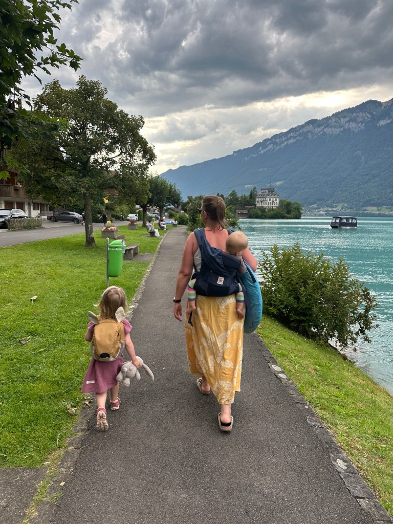 Die Parkplätze vor Ort sind knapp und wahrscheinlich würde der große Camper dort eh nicht stehen können, deshalb laufen wir zum Strandbad. So spazieren wir durch Iseltwald, runter von der Anhöhe des Parkplatzes, zum Ufer am Brienzersee und kommen dabei an liebevoll gestalteten Gärten und alten Holzhäusern vorbei. Am Ufer passieren wir ein Hostel und ein nettes Restaurant, zuletzt noch ein paar Wohngrundstücke und schon sind wir da.