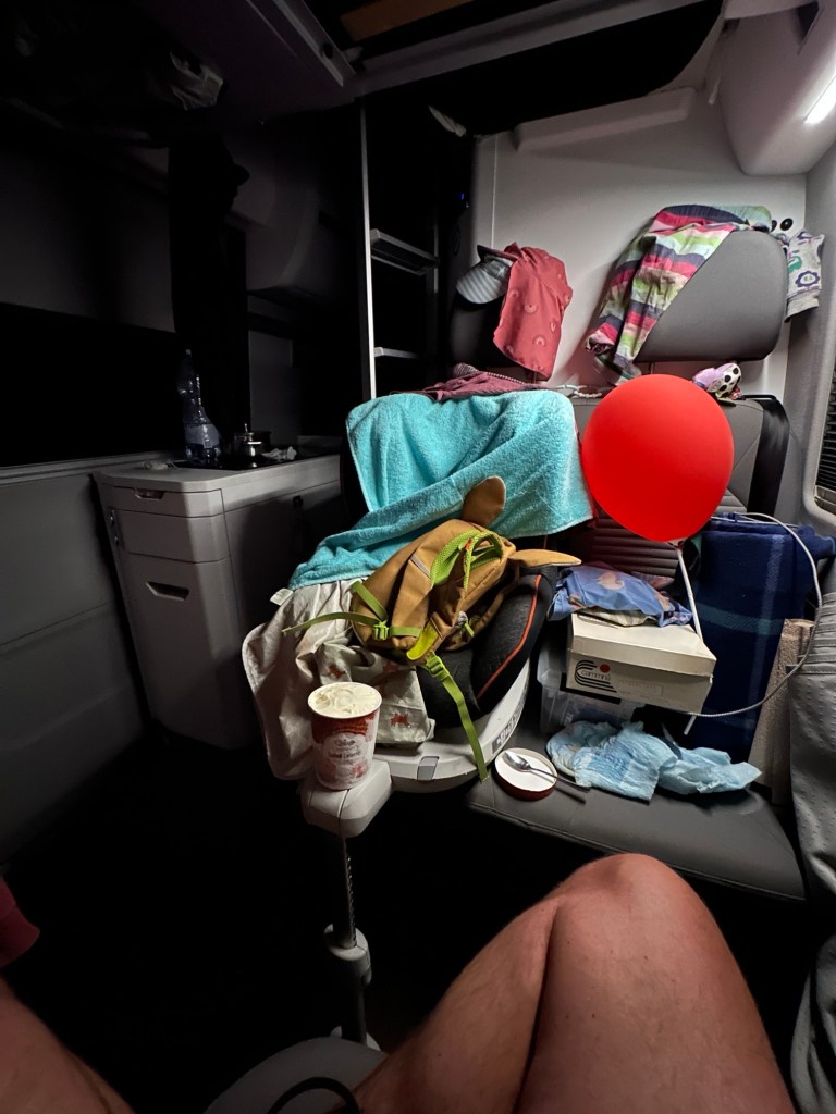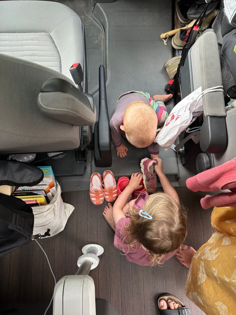 Aber im Großen und Ganzen verläuft auch der Abend sehr harmonisch. Während Lu Spinat mit Kartoffeln und Fischstäbchen kocht, macht die Große nochmal ihren Schuhladen für die Kleine auf und bietet ihr allerhand Schuhe an. Die Kinder essen sich satt auch wenn es bei der Kleinen zum Ende etwas chaotisch wird. Beim Bettfertigmachen haben sie Spaß mit einem Buch. Lu begleitet die Große in den Schlaf und schläft unwiederbringlich ein. Nachdem ich die Kleine erfolgreich im Lummerland verabschiedet habe, setze ich mich noch mit einem halben Becher Eis auf den ausnahmsweise umgedrehten Fahrersitz, schreibe am Blog und lasse es mir gutgehen. Was für ein Tag!