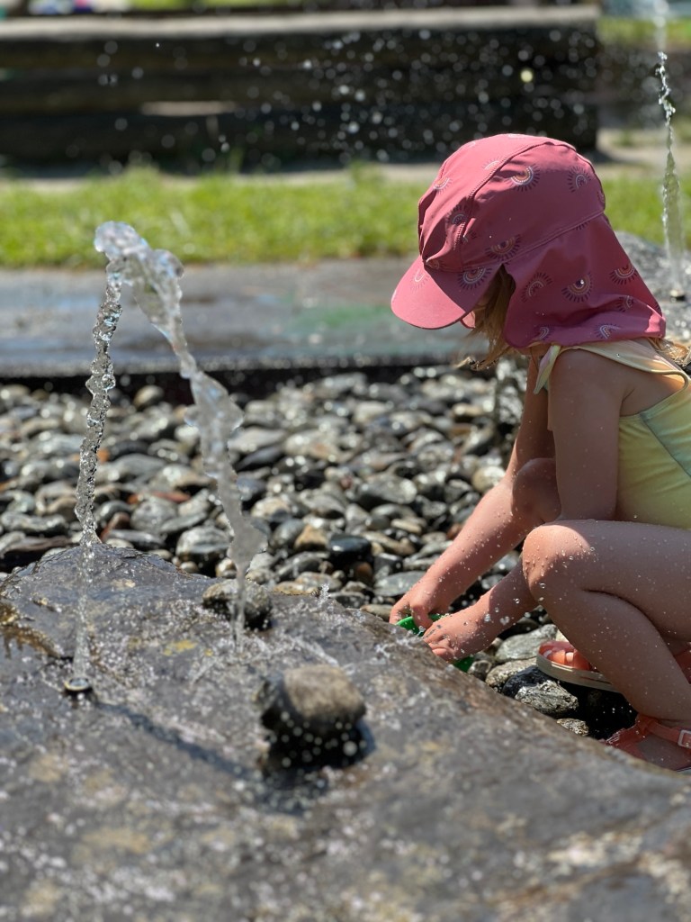Die Wassertemperatur liegt bei 16 Grad und wenn ich beim Schwimmen die Beine absinken lasse, dann wird es dort unten richtig kalt. Als wir das letzte Mal hier waren, haben wir uns sehr langsam an das Wasser herangetastet und so auch dieses Mal. Lu geht als erstes und die Große möchte auch mitkommen. Ich bleibe mit der Kleinen bei einem Wasserspiel aus Fontänen, die aus großen Steinen spritzen. Sie ist genauso begeistert, wie ihre große Schwester damals. Nebenbei kann ich ein bisschen beobachten, wie Lu sich langsam über die Treppe ins Wasser begibt und die Große auf der Treppe, vermutlich bis zu den Knöcheln im Wasser steht. Sie kann noch nicht schwimmen, aber der Bereich ist künstlich angelegt und nur etwas mehr als hüfttief. Sie freut sich, dass sie mit zum Wasser kommen kann und hilft der Mama dabei, sich nass zu machen und an das kalte Wasser zu gewöhnen. Der ein oder andere Juchzer bleibt nicht aus. Mit einem kleinen Buddelförmchen schaufelt sie immer wieder Wasser und ist in ihrem Element.