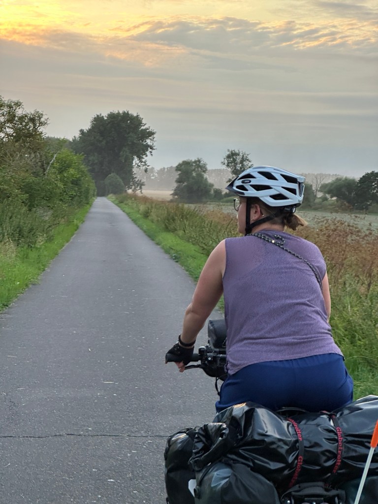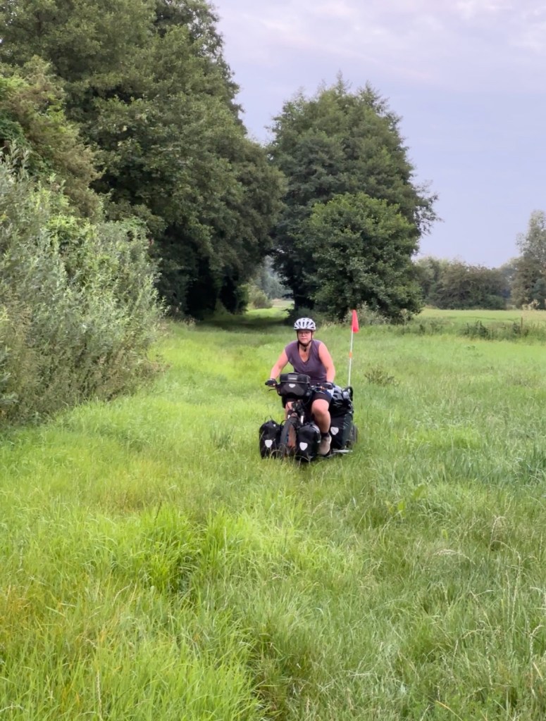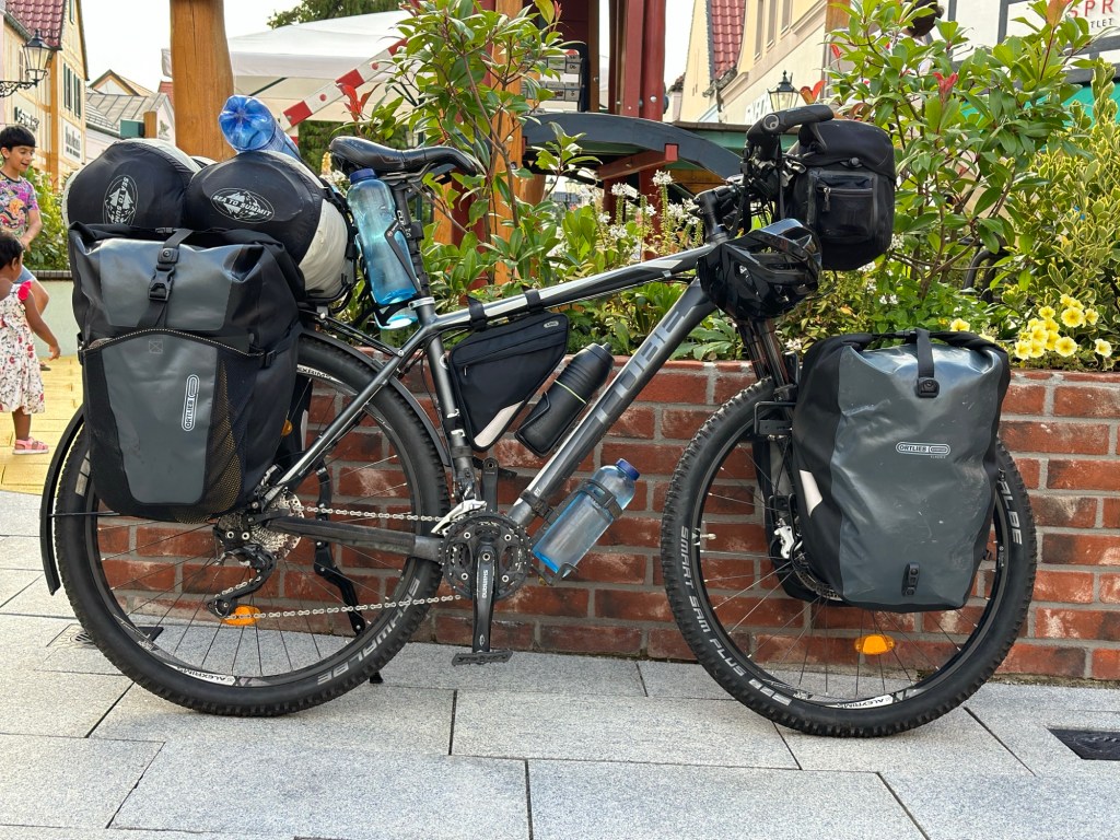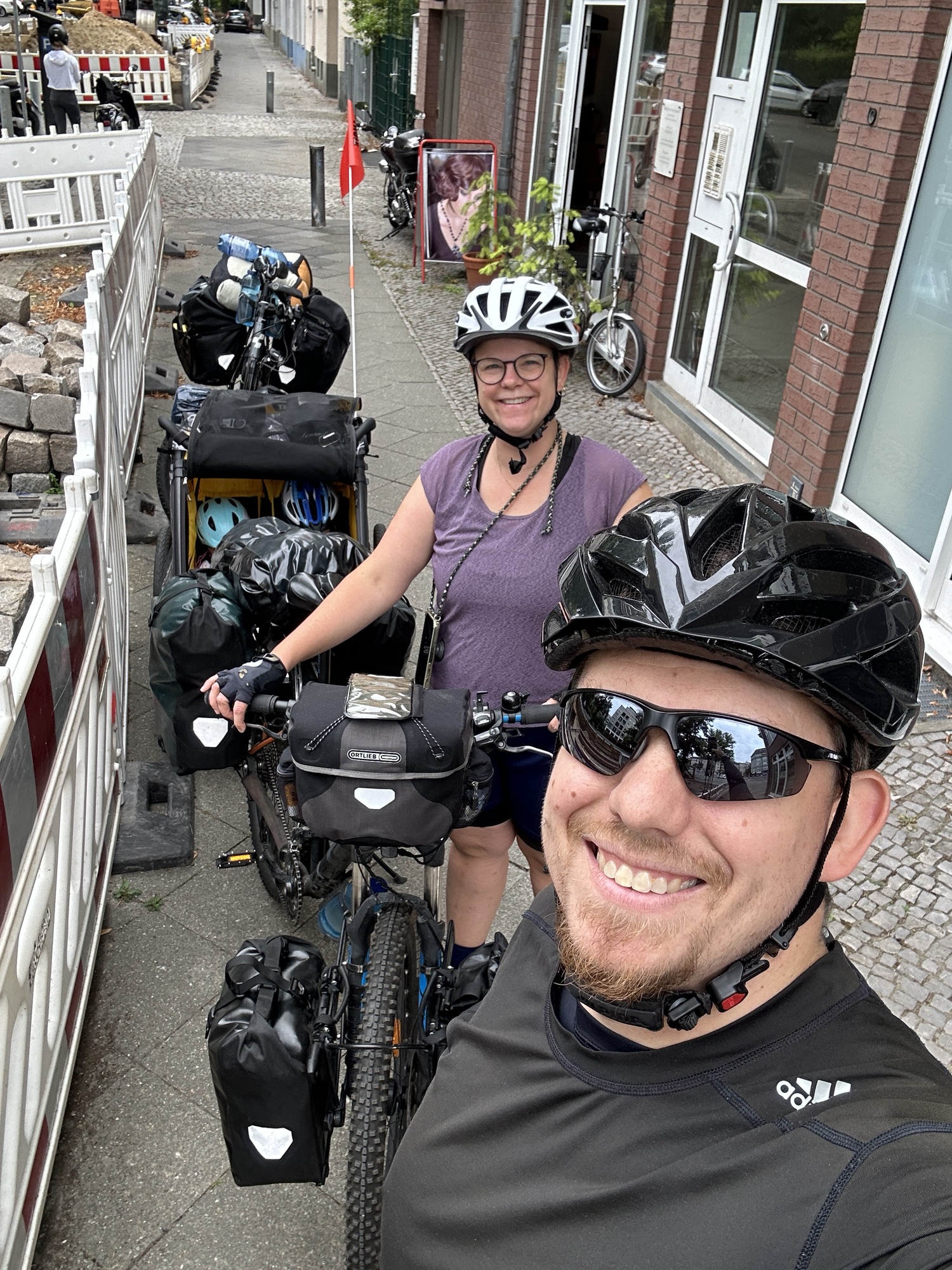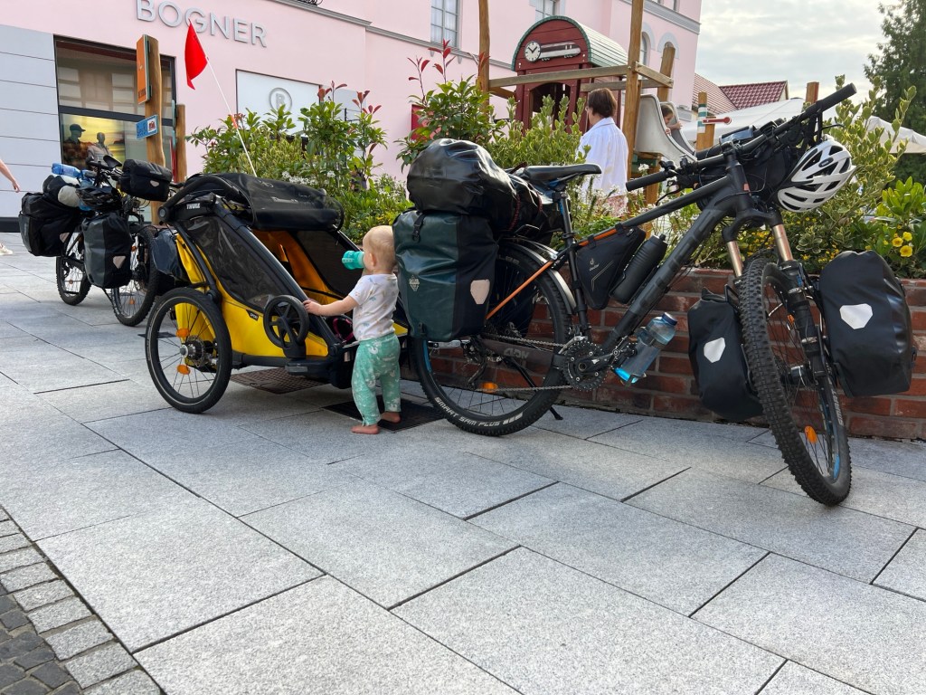 Es hat länger gedauert, als geplant, aber gegen 15:00 Uhr stehen wir mit den Rädern bereit vor der Haustür. Wir entscheiden spontan, dass wir einen Teil von der Kinderkleidung doch zu Hause lassen, weil sich die Taschen kaum schließen lassen. Immer noch völlig überladen, wollen wir los rollen. Aber nun macht uns die Navi App noch einen Strich durch die Rechnung. Wir sind noch nicht ganz auf der Route und jedes Mal, wenn Lu die Route startet, wird sie angepasst und hat plötzlich einen ganz anderen Verlauf. Es hilft, die Route zu starten, während das Handy im Flugmodus ist. Was allerdings passiert, wenn Lu das Internet wieder einschaltet, weiß keiner so genau. Lassen wir uns überraschen.