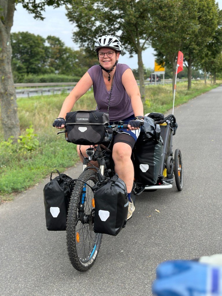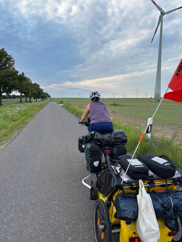 Wir grooven uns ein und das rechte Rad des Anhängers knarzt. Ab und zu meldet sich grunzend die Bremse des Anhängers (womöglich hätte ich die Bremsscheiben des Anhängers zu Hause lassen sollen, weil die Bremse nur beim Schieben zum Einsatz kommt und somit jetzt eher stört). Zu guter letzt eiert das rechte Rad auch noch, seit ich vor ein paar Monaten mit dem Anhänger an einer Verengung hängen geblieben bin. Ich habe Werkzeug dabei und werde mich im Laufe der Tour darum kümmern.