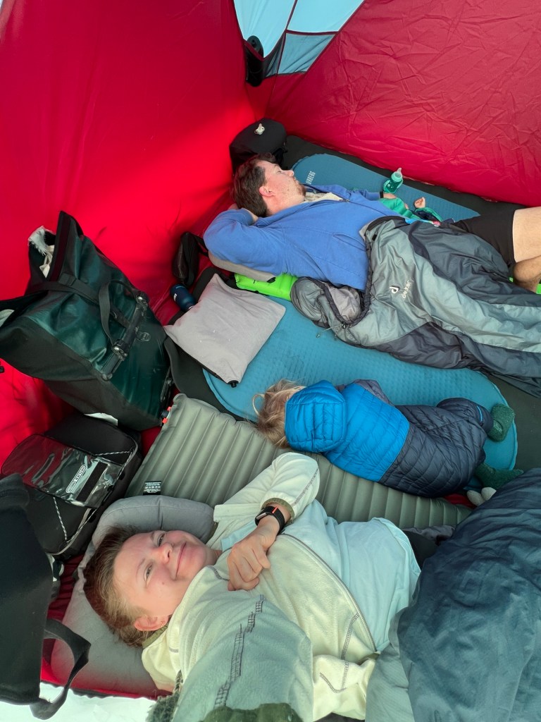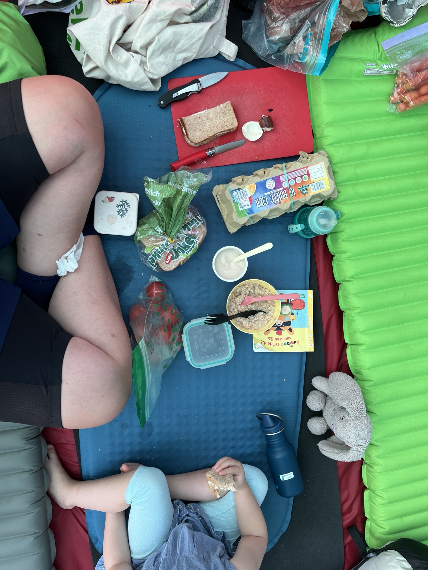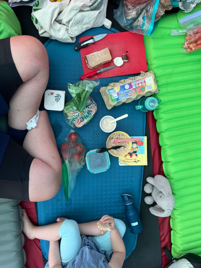 Wir frühstücken im Zelt: Es gibt Apfel-Porridge, Obst und Laugenstange für die Kinder, Brot mit Aufstrich für Lu und Nüsse, Sellerie, Möhre und Camembert für mich. Natürlich wollen die Kinder bei uns alles probieren. Bis auf die Nüsse, gibt es von allem einen Happen.