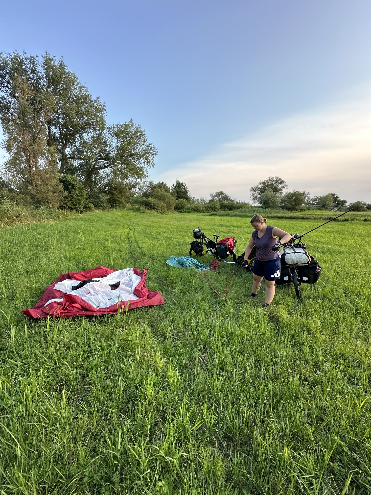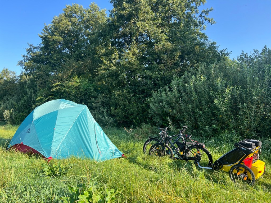Das Zelt steht, die Matten sind aufgepumpt und wir schon halbwegs im Schlafsack, da fängt es an zu regnen. Wir machen abends immer alles Regenfest auf unseren Touren, weil ich keine Lust habe mitten in der Nacht rauszutapern und erst dann alles zu sichern. Vor allem, wenn es schon regnet. Diesmal habe ich nur eine Kleinigkeit in Rückennetzen des Anhängers vergessen, also fixe ich das noch kurz und kurze Zeit später sitzen wir gut geschützt in einem sehr ergiebigen Regen.