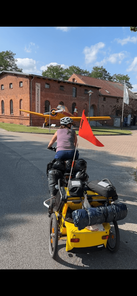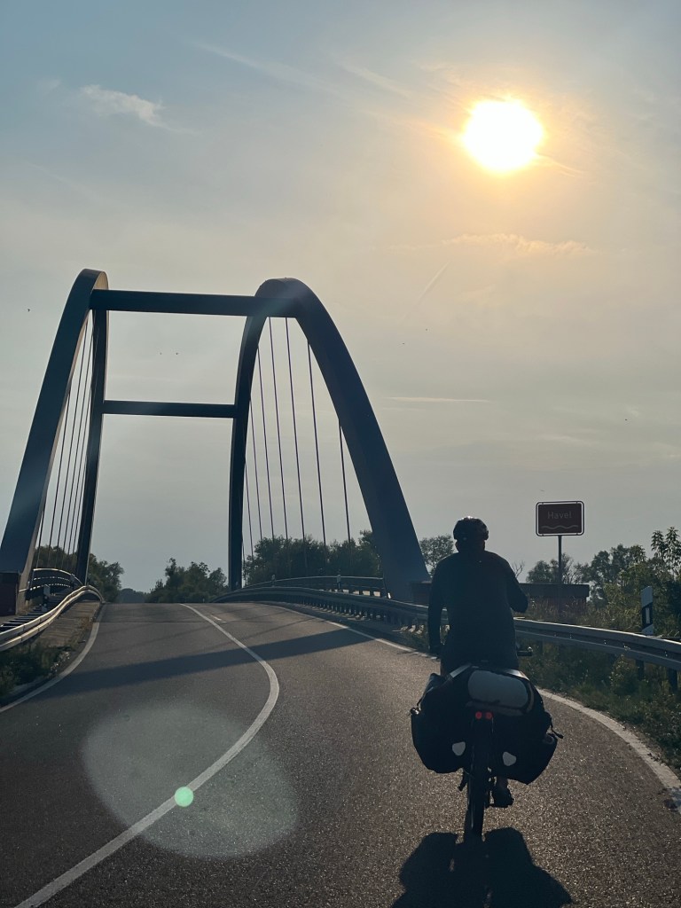 Als wir wieder unterwegs sind, flitzt ein drahtiger, älterer Mann auf einem Klapprad an uns vorbei. Er scheint es eilig zu haben und tritt ordentlich in die Pedale. Wenig später kommt er aus einer anderen Richtung wieder auf unsere Route. Er hat womöglich ein Ziel Abseits der Strecke gehabt. Er heizt wieder voraus. Wir treffen ihn noch zwei Mal, weil er sich offensichtlich wieder ein paar Orte angesehen hat und wir ihn deshalb einholen konnten. Als wir nach einem möglichen Ort für unseren heutigen Schlafplatz suchen, treffen wir ihn ein letztes Mal. Er guckt sich die Havel an und ein Schild, dass dort steht. Dann düst er in die Richtung aus der sowohl wir, als auch er kamen zurück und wer weiß, wie weit er es an dem Tag noch geschafft hat. Sein Tempo auf dem kleinen Rad und vor allem seine Ausdauer waren auf jeden Fall bemerkenswert.