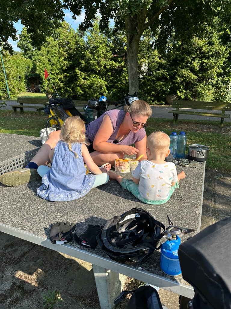 Bei einer Pause können sich zwar die Muskeln etwas erholen, aber wir sind ja weiterhin Eltern, also: Spielen mit den Kindern, essen kochen, wickeln, Konflikte begleiten stehen auf dem Pausen-Programm. In Gollenberg finden wir einen kleinen Spielplatz neben einer Lilienthal-Ausstellung und hier legen wir eine späte Pause ein. Die Kinder bekommen Bewegung und wir okkupieren die Tischtennisplatte für unser Abendessen. Es gibt Ravioli und ein Reisgericht. Beides wird in einem Kochbeutel im Wasserbad erhitzt. Wir sitzen beim Essen alle auf der Tischtennisplatte und unweit von uns steht ein Storch in seinem Horst und schert sich nicht um den Trubel, den wir verursachen.