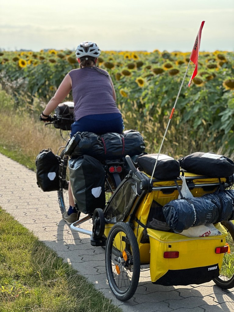 Es ist nur leicht bewölkt und immer, wenn ein Auto an uns vorbeifährt, stellen wir uns vor, wie gemütlich es wäre, jetzt im klimatisierten Auto zu sitzen. Wir waren vor Kurzem auf Camper Reise und sind wohl noch etwas verwöhnt.